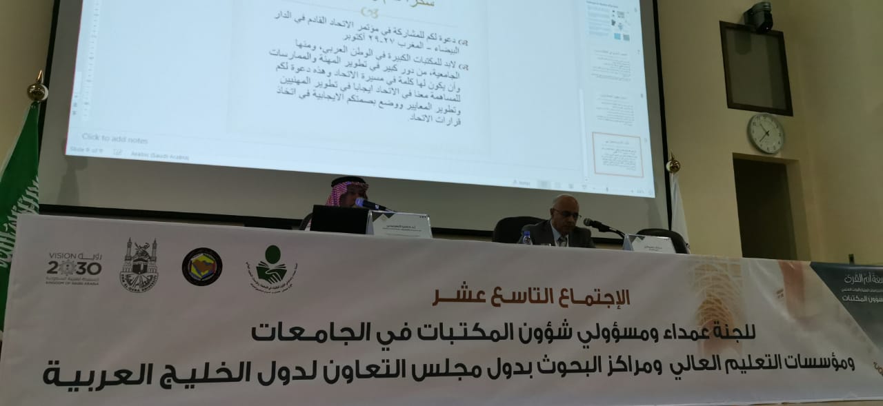 شارك سعادة المشرف على عمادة شؤون المكتبات بجامعة الأمير سطام بن عبد العزيز د. عبدالعزيز بن سعد بن سعيدان يومي الأربعاء والخميس(11-12 جمادى الثانية1441 هجريه) في فعاليات الإجتماع التاسع عشر للجنة عمداء ومسؤولي شؤون المكتبات في الجامعات ومؤسسات التعليم العالي ومراكز البحوث بدول مجلس التعاون لدول الخليج العربية، والذي استضافته جامعة أم القرى بمنطقة مكة المكرمة، برعاية معالي مديرها الأستاذ الدكتور عبدالله بن عمر بافيل، وبحضور أمين اللجنة الدكتور خالد الحبشي، والمشرف العام على المكتبة الرقمية السعودية د. محمد بن فاروق عداس وعمداء شؤون المكتبات في الجامعات السعودية والخليجية. وتضمن الاجتماع مناقشة المحاور التالية: متابعة محضر الاجتماع الثامن عشر- إنشاء منصة تعليمية خليجية للوصول الحر- متابعة وتقييم الخطة الخمسية للجنة (٢٠١٦-٢٠٢٠) - التدريب التعاوني للمتخصصين على مستوى مجلس التعاون الخليجي، كما تضمن الاجتماع عقد ندوة حول كل من ضبط الجودة والتميز لخدمات المعلومات في المكتبات الاكاديمية، وكذلك تجربة الفهرس العربي الموحد في العمل التعاوني والتدريب.