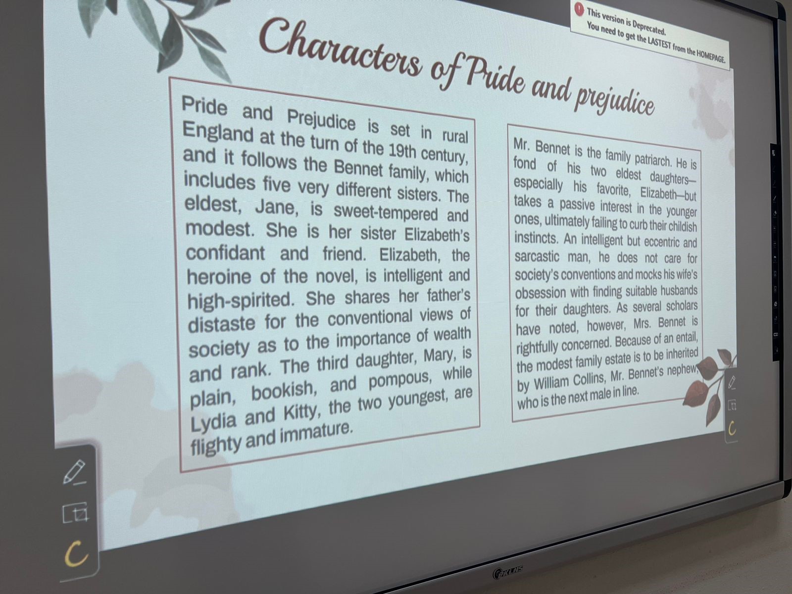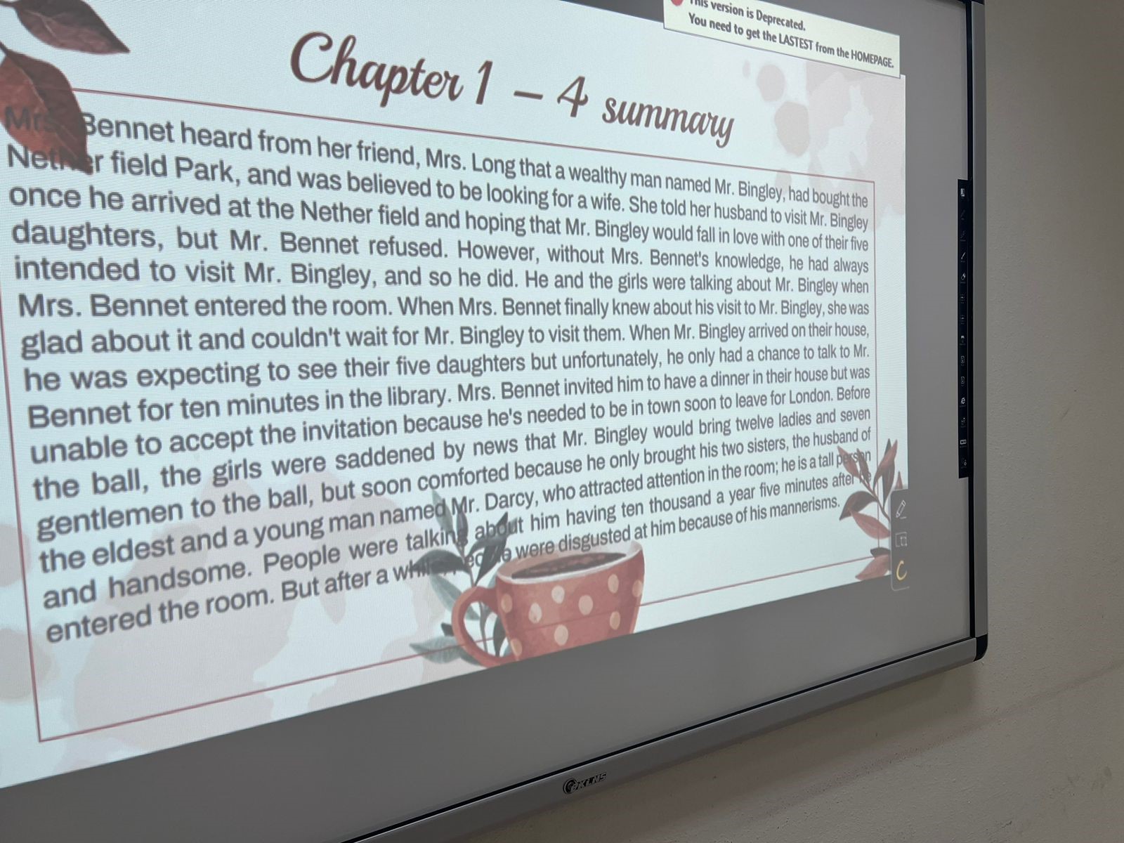 وقدمت الطالبة في إبراهيم الدغفق ، و الطالبة مساهر إبراهيم رواية ( تحامل و كبرياء ) بداية من التعريف بالكاتبة جين أوستن و من ثم سرد الشخصيات الرئيسية للرواية إلى تلخيص القصة بالنهاية (الفصول1-10) و التحدث عن ابرز ملامحها ومناقشة الشخصيات الرئيسية و تسليط الضوء على اهم النقاط في الحبكة .