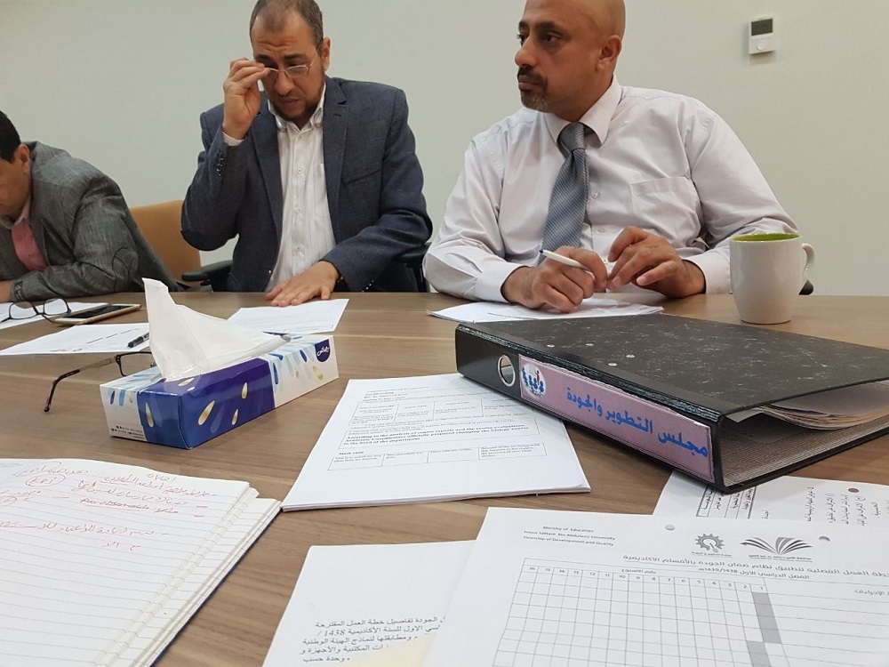 وعرض منسق الجودة الأستاذ اسعد محمد عثمان خطط التحسين للمقررات الأكاديمية في ضوء التقييمات و محتويات خطة العمل الفصلية لتطبيق نظام ضمان الجودة بالأقسام الأكاديمية وما تم تنفيذه من بنودها.