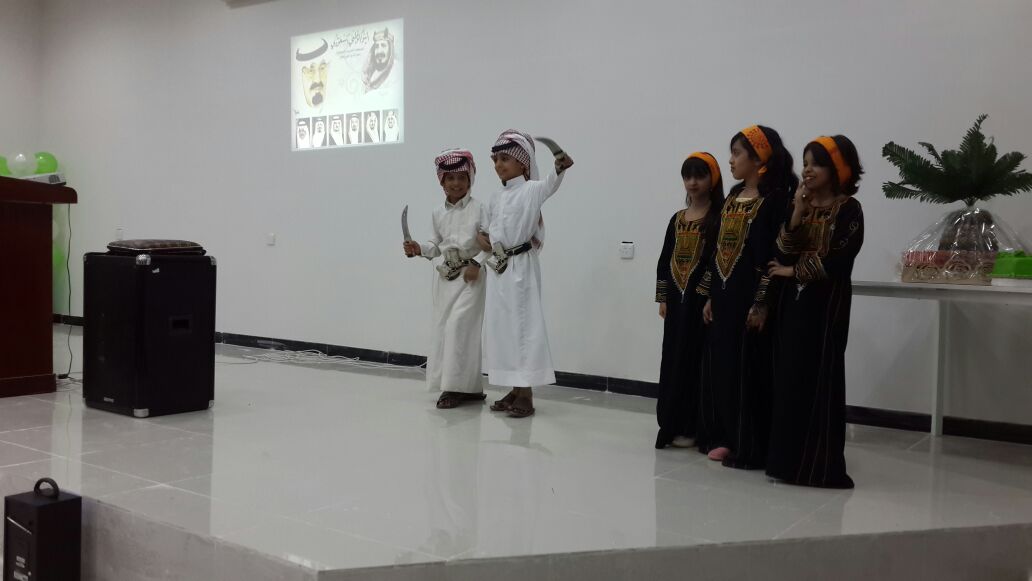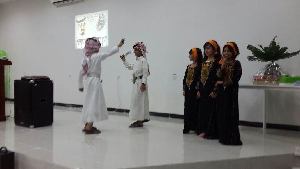 حيث بدأ الحفل بآيات من القرآن الكريم تلاه كلمة سفيرة الطالبات الطالبة رغد الدغفق وتخلل الحفل عرض فلم وثائقي عن المملكة و فقرات متنوعة من إنشاد و قصائد وطنية و عرض للتراث ومسابقة ثقافية للحضور.