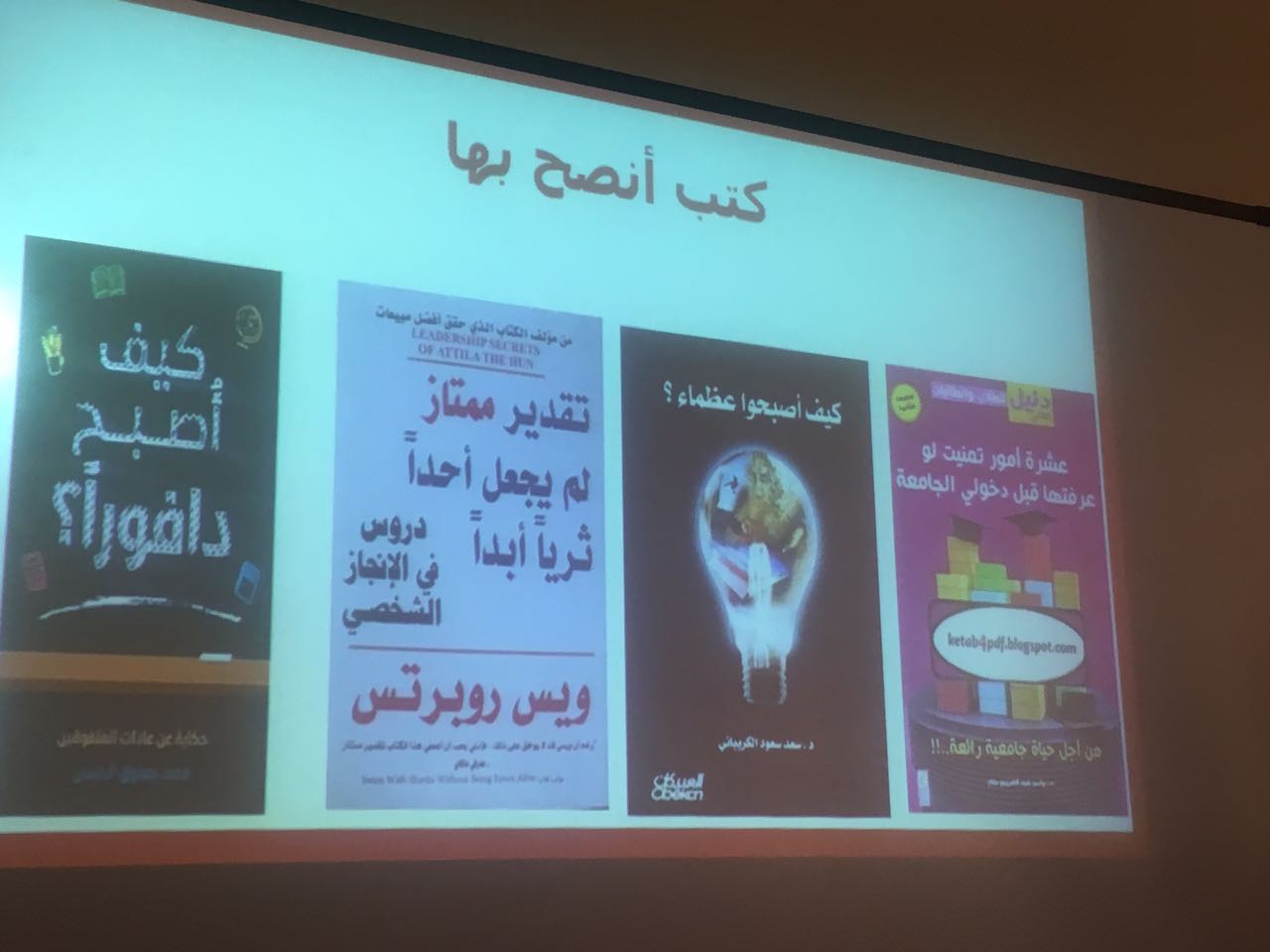 وفي ختام الدورة شكرت المدربة الطالبات على حضورهن وتفاعلهن ناصحة إياهن على تحقيق أهدافهن مهما كانت العوائق والعقبات وعدم التأثر والاستماع لكلام المحبطين كما طرحت أيضاً كتب و نماذج اختبارات تساعد الطالبات في تحديد التخصصات والمجالات التي تناسبهن في حياتهن الجامعية والاجتماعية.