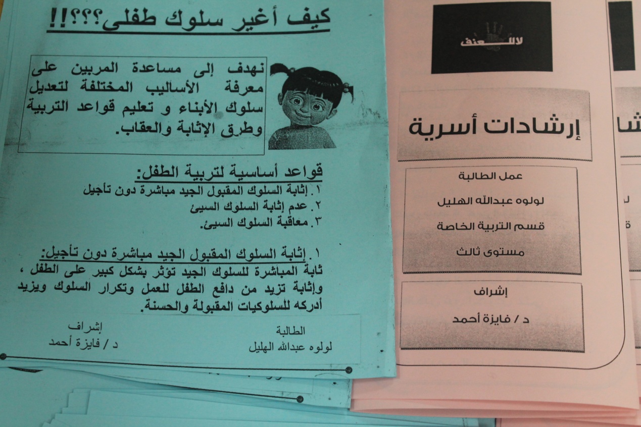 المجموعة الأولي طالبات المستوى الثالث, وعددهم (100) طالبة تم تدريبهم يوم الأحد الموافق 23/1/1436هـ, بإشراف الدكتورة فايزة احمد من خلال ورشة عمل بطريقة عملية؛ حيث جُهِزت خامات الورشة من بيئة الخرج الطبيعية، وسوف تقدم الطالبات في حملة التوعية ما تعلموه بطريقة عملية, وهذا البرنامج بعنوان: الحملة التوعوية من الاضطرابات السلوكية والانفعالية وطرق الوقاية منها ( العنف - النشاط الزائد - العدوان - الانسحاب - العناد - القلق - الاكتئاب - السرقة - الكذب - صعوبات التعلم - التوحد................. ) بمحافظة الخرج، ويحمل مشروعهن اسم ( التدخل المبكر وطرق الوقاية من الاضطرابات السلوكية ).