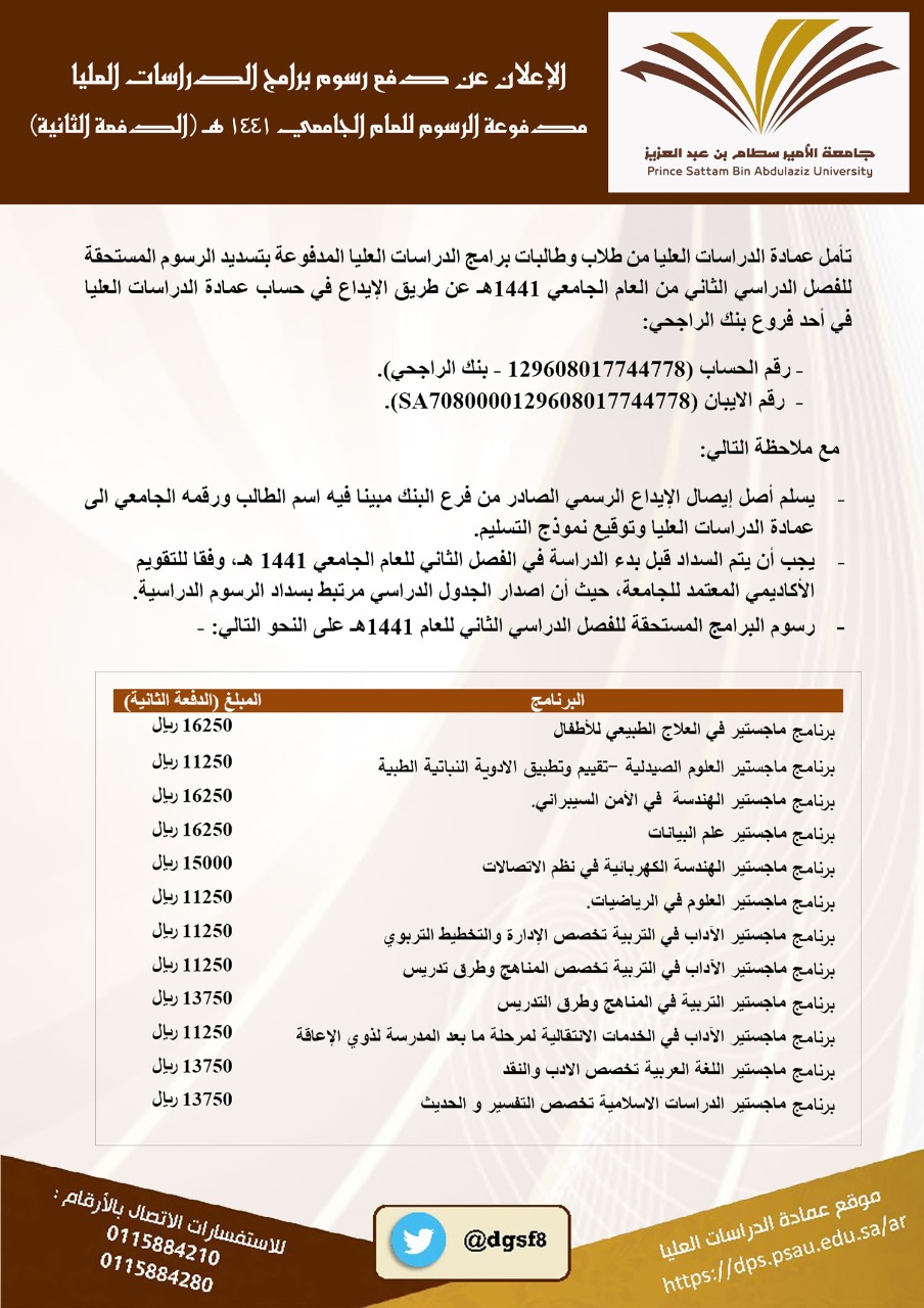 تأمل عمادة الدراسات العليا من طلاب وطالبات برامج الدراسات العليا المدفوعة بتسديد الرسوم المستحقة للفصل الدراسي الثاني من العام الجامعي 1441هـ عن طريق الإيداع في حساب عمادة الدراسات العليا في أحد فروع بنك الراجحي:
