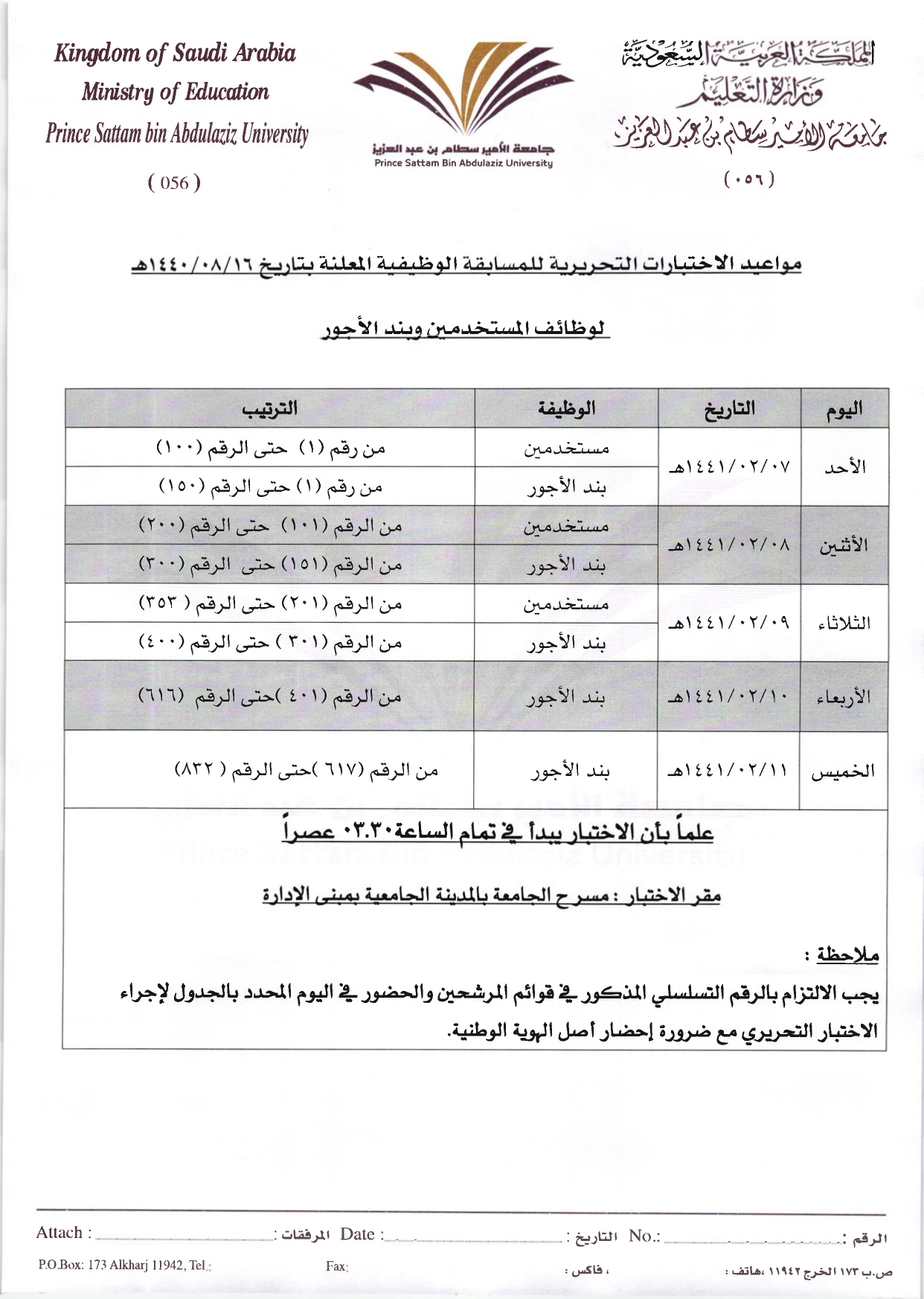 تعلن عمادة الموارد البشرية بجامعة الأمير سطام بن عبدالعزيز عن مواعيد الاختبار التحريري للمرشحين في المسابقة الوظيفية المعلنة بتاريخ 16/8/1440هـ (بند الأجور والمستخدمين) حسب الجدول الموضح أدناه، وبإمكان المتقدمين الدخول على موقع التوظيف الإلكتروني بموقع الجامعة لمعرفة حالة الترشيح.