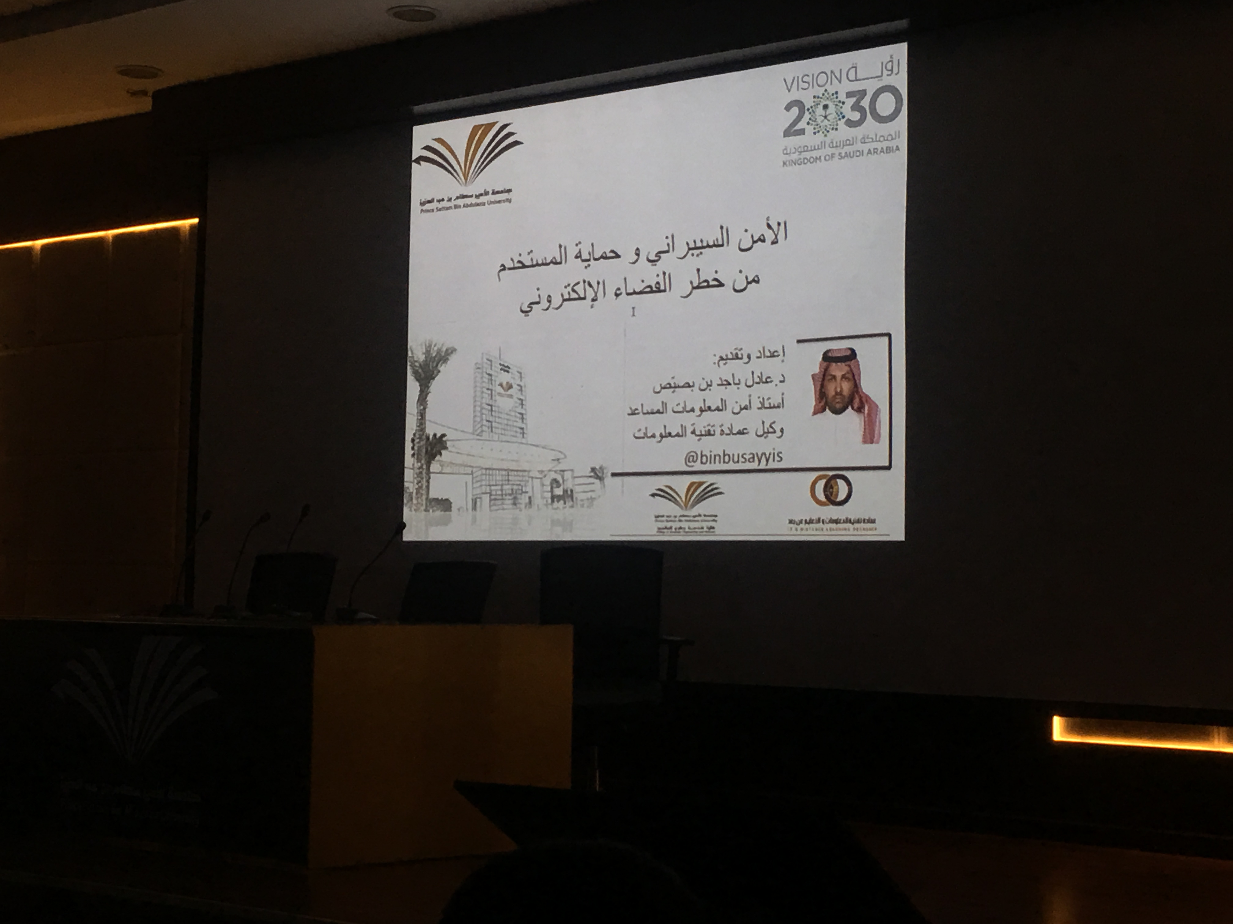 قدمها الدكتور عادل بن باجد بن بصيص وكيل عمادة تقنية المعلومات والتعليم عن بعد حيث كانت تهدف إلى حماية المستخدم من مخاطر الفضاء الإلكتروني وكانت المحاور (التعريف بمصطلح الأمن السيبراني، واحصائيات وتاريخ الإنترنت في المملكة واحصائيات أبرز الهجمات الإلكترونية في المملكة، النشأة القانونية للأمن السيبراني في المملكة، وأبرز مخاطر الفضاء الإلكتروني).