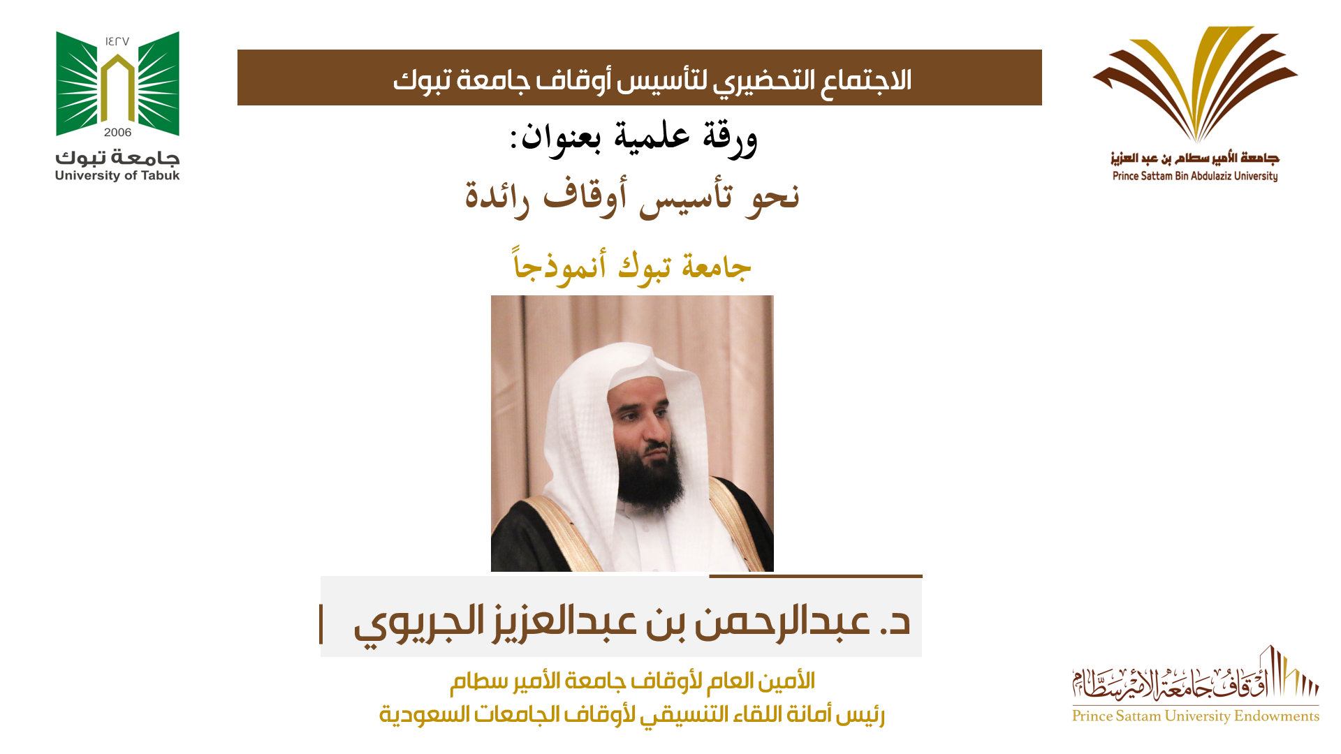بدعوة كريمة من معالي مدير جامعة تبوك شارك الأمين العام لأوقاف الجامعة الدكتور عبدالرحمن بن عبدالعزيز الجريوي في الاجتماع التحضيري لتاسيس أوقاف جامعة تبوك ، الذي عقد يوم الخميس 06 ذو القعدة 1439 بمكتب معالي مدير جامعة تبوك ، حيث عرض الدكتور الجريوي ورقة علمية بعنوان "نحو تاسيس أوقاف رائدة .. جامعة تبوك أنموذجاً" تحدث فيها عن واقع الأوقاف في المملكة ، وكذلك واقع أوقاف الجامعات في المملكة ، والمتطلبات اللازمة لتأسيس أوقاف جامعة تبوك.