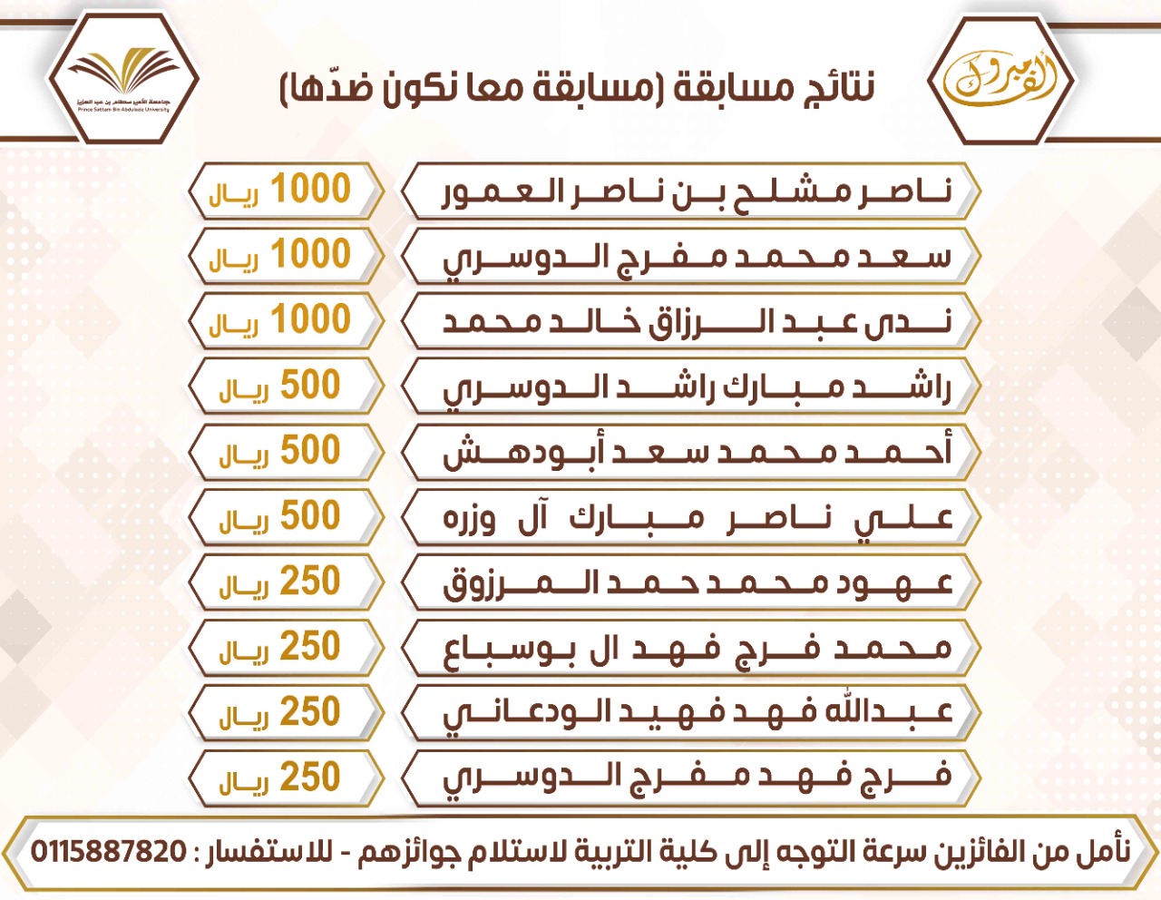 وعلى الفائزين سرعة التوجه لكلية التربية بمحافظة وادي الدواسر لإستلام جوائزهم .