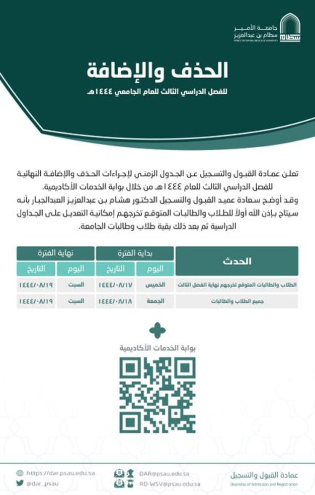 تعلن عمادة القبول والتسجيل عن الجدول الزمني لإجراءات الحذف والإضافة النهائية للفصل الدراسي الثالث 1444هـ من خلال بوابة الخدمات الأكاديمية عبر الرابط التالي: