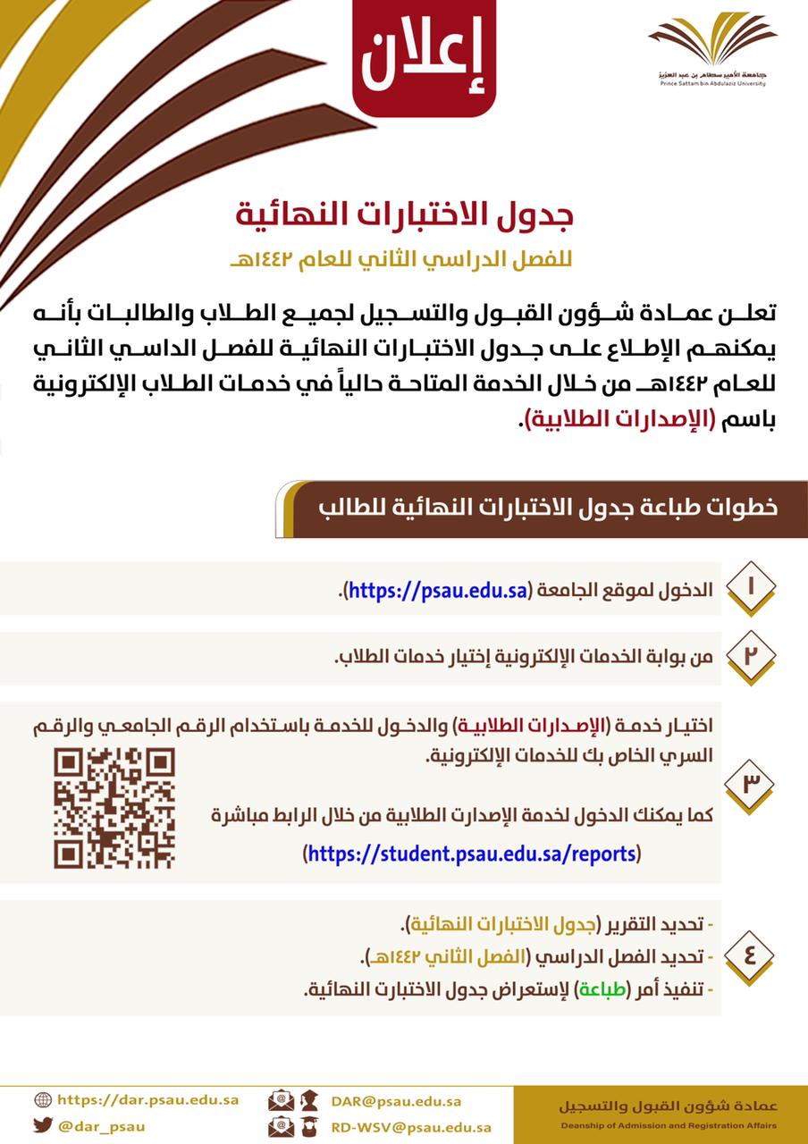 تعلن عمادة شؤون القبول والتسجيل لجميع الطلاب والطالبات بأنه يمكنهم الإطلاع على جدول الاختبارات النهائية للفصل الدراسي الثاني للعام 1442هـ من خلال الخدمة المتاحة حالياً في خدمات الطلاب الإلكترونية باسم (الإصدارات الطلابية) عبر الرابط التالي: https://student.psau.edu.sa/reports