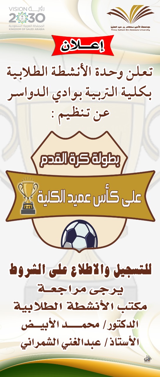 يسر وحدة الانشطة الطلابية في كلية التربية بوادي الدواسر أن تنظم بطولة كأس عميد الكلية لكرة القدم ، على الراغبين في التسجيل الاطلاع علي الشروط وذلك بمراجعة مكتب الأنشطة الطلابية بالكلية .