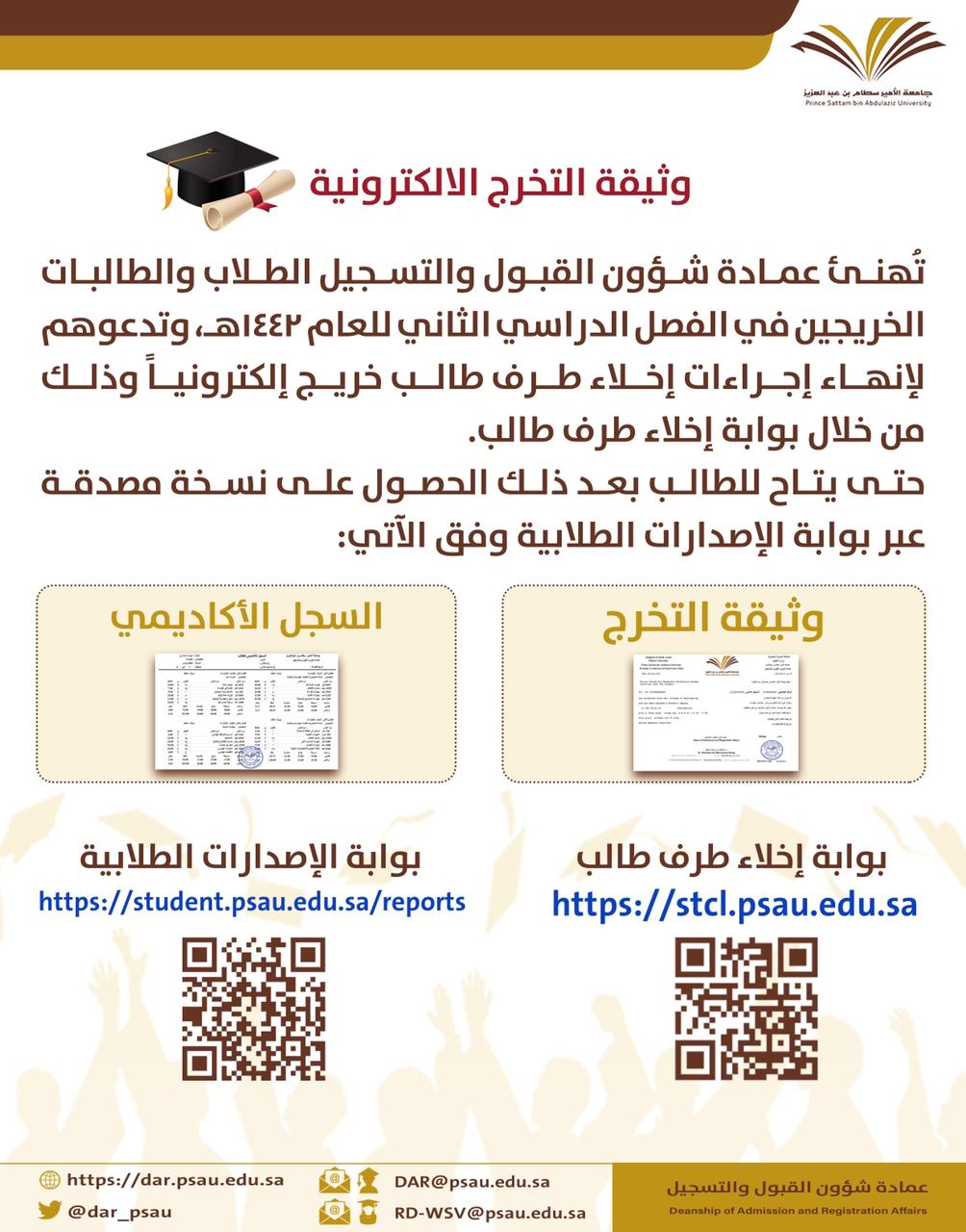 تُهنئ عمادة شؤون القبول والتسجيل الطلاب والطالبات الخريجين في الفصل الدراسي الثاني للعام 1442هـ ، وتدعوهم لإنهاء إجراءات إخلاء طرف طالب خريج إلكترونياً وذلك من خلال بوابة إخلاء طرف طالب.