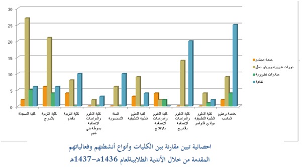 وقد ذكرت وكيلة عمادة شؤون الطلاب الدكتورة دلال المطرفي في تصريح لها أن عدد الكليات التي اعتمدت الأندية الطلابية فيها لهذا العام 1437-1438هـ قد بلغت 12 كلية، وعدد النوادي المعتمدة (48) ناديًا، تعمل تحت مظلة عمادة شؤون الطلاب وبإشرافها وبمتابعة دائمة لفعالياتها وأنشطتها في جميع الكليات. وكان من برامجها وفعالياتها عقد دورات وندوات وورش عمل وعدد من البرامج العلمية والتطوعية والإبداعية والفنية.