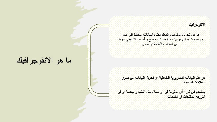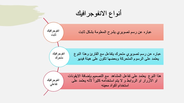 تعريف الانفوجرافيك وعرض نماذج مختلفة من الانفوجرافيك المسميات المختلفة للانفوجرافيك؛ أنواع الانفوجرافيك؛ خطوات تصميم الانفوجرافيك؛ نصائح يجب اتباعها عند تصميم الانفوجرافيك؛ بعض البرامج المستخدمة في تصميمه وبعض المواقع التي تدعم الانفوجرافيك بالإضافة إلى تطبيق عملي لتصميم الانفوجرافيك ثابت وكيفية تحويله إلى متحرك باستخدام برنامج الباوربوينت لتوفره بجميع الأجهزة.