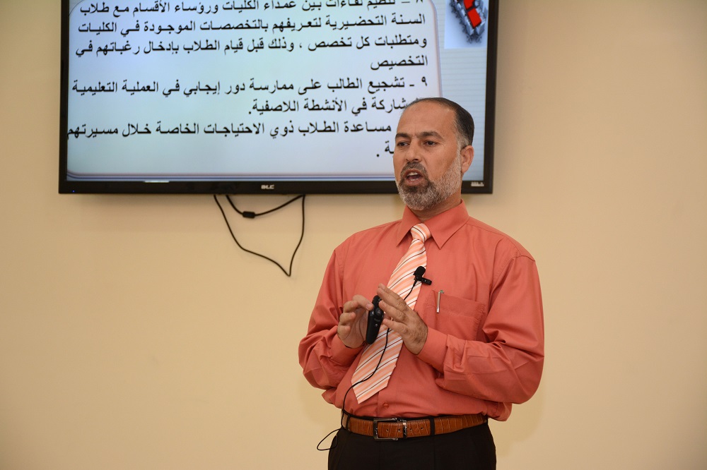 وقد قام بتقديم ورشة العمل الدكتور فراس محمد مشعور رئيس وحدة الإرشاد الأكاديمي في العمادة والتي شهدت تفاعلا كبيرا من الطلاب الذين أثروا الورشة بمداخلاتهم ومشاركاتهم . حيث تناولت الورشة عدة محاور منها مفهوم الإرشاد الأكاديمي ، وأهدافه وفلسفة الإرشاد الأكاديمي ، كما تناول أهمية الإرشاد في حماية الطالب من التعثر الدراسي. ثم تعرّض إلى بعض المفاهيم التي تمس الطالب الجامعي كالمعدل الفصلي والمعدل التراكمي ، والعبء الدراسي والإنذار الأكاديمي ، والحرمان ، والتأجيل والاعتذار عن دراسة فصل دراسي وعقوبة الغش في الاختبارات وغيرها. كما تناولت الورشة توضيح حقوق الطالب الجامعي وواجباته. هذا بالإضافة إلى توضيح آلية التقدم للاختبارات البديلة . وفي الختام تم فتح باب الأسئلة للرد على استفسارات الطلاب .