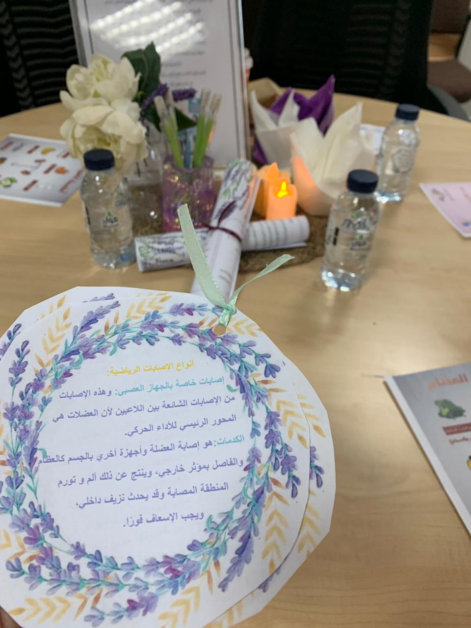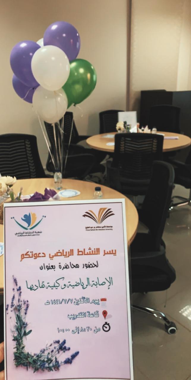 أقام النشاط الرياضي بالكلية بالتعاون مع وحدة العمل الطلابي محاضرة بعنوان (الإصابات التي تحدث أثناء الرياضة) يوم الأثنين الموافق 7- 7– 1441هـ. للدكتورة / نجلاء محمود الطبيبة بالكلية. وتهدف المحاضرة للتعرف على مختلف الإصابات الرياضية وكيفية تفاديها ,والتعرف على أسباب الإصابات وطرق التعامل معها ,وتأثير المكون النفسي وعلاقته بالجانب الجسمي في مجال الرياضة ,وتشمل الدورة علي معلومات التي يجب أن تلم بها الطالبة أثناء ممارسة النشاط الرياضي , ونشر الوعي الصحى واتخاذه منهج وأسلوب حياة وذلك لما لها من أثر ايجابي على صحة الجسم والعقل . واستهدفت الحملة طالبات الكلية وقد حضر من هم 50 طالبة