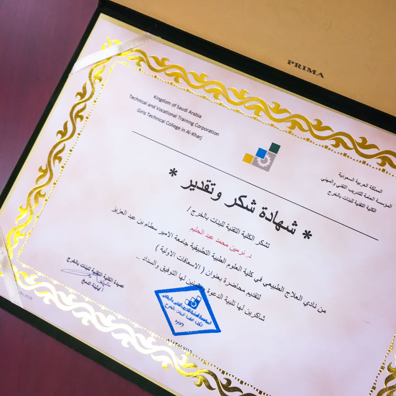 أقام نادي العلاج الطبيعي بكلية العلوم الطبية التطبيقية – أقسام الطالبات – محاضرة بعنوان "الإسعافات الأولية" قدمتها د/ نيرمين محمد عبدالحليم بكلية التقنية للبنات بالخرج وذلك يوم الخميس الموافق 7/16/ 1438هـ والتي هدفت إلى اكساب الطالبات المهارات اللازمة لإسعاف المصابين وذوي الأمراض المزمنة .
