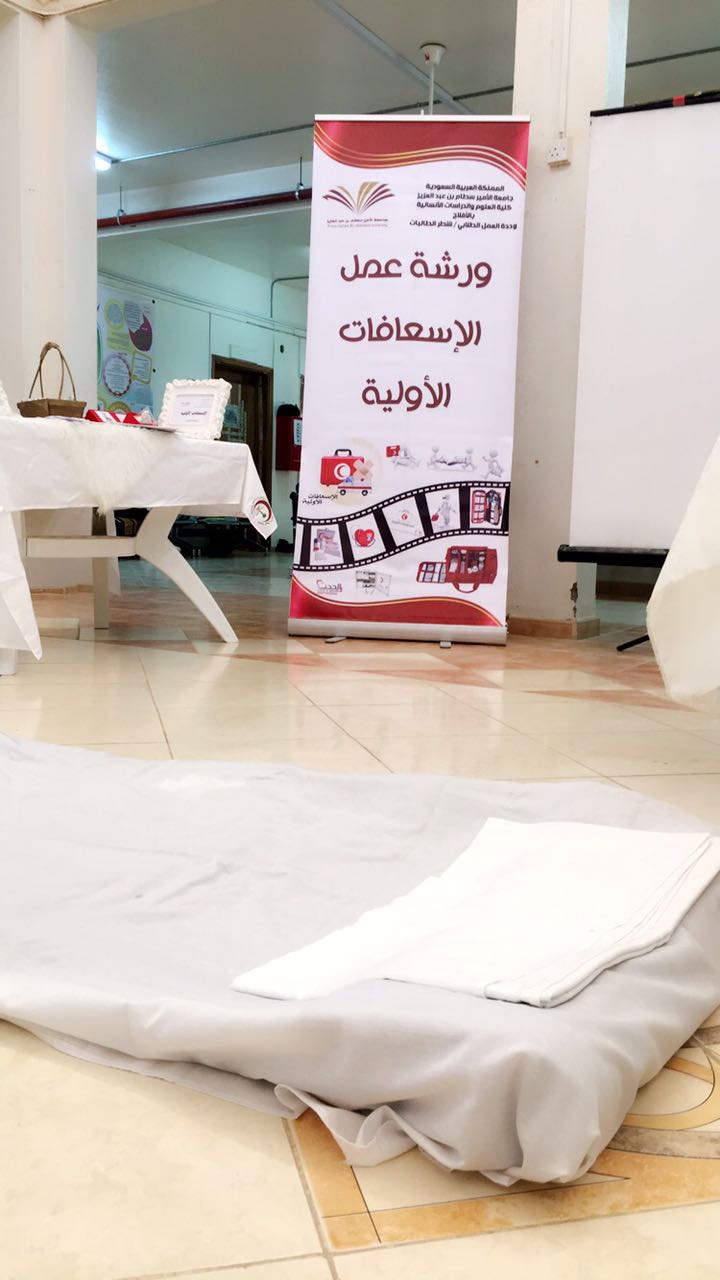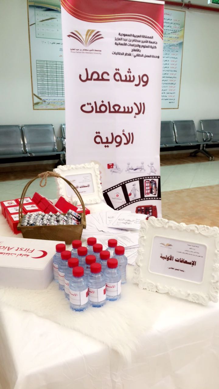 نظمت وحدة العمل الطلابي بكلية العلوم والدراسات الإنسانية بالأفلاج ورشة عمل عن الإسعافات الأولية قدمتها طبيبة الكلية د .مناهل صديق يوم الأربعاء 7/29 / 1438هـ في تمام الساعة التاسعة في بهو المبنى الرئيسي