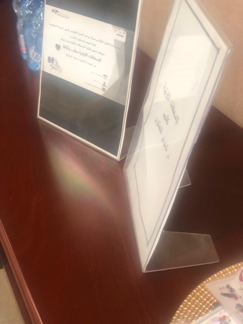 فقد نظمت وحدة العمل الطلابي متملثة بوحدة العمل التطوعي (فريق احسان التطوعي ) بكلية هندسة و علوم الحاسب فعالية الاسعافات الاولية تحت عنوان الاسعافات الاولية مطلب و ثقافة , قدمت ذلك الدكتورة شدوى الحناوي يوم الاربعاء 25-6-1441هـ من الساعة 10-12م في مسرح الكلية .