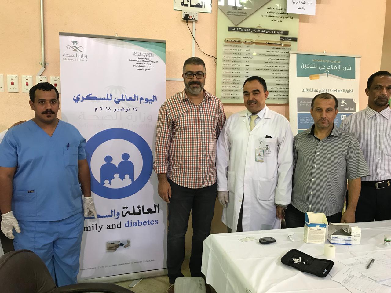 حيث تضمن اليوم الأول تفعيل اليوم العالمي لمرض السكري الذي يصادف يوم الأربعاء 1440/3/6 هــ الموافق 2018/11/14 م وذلك بالتعاون مع مستشفى السليل العام، حيث تم أجراء فحص السكري ا للطلاب والموظفين وأعضاء هيئة التدريس .