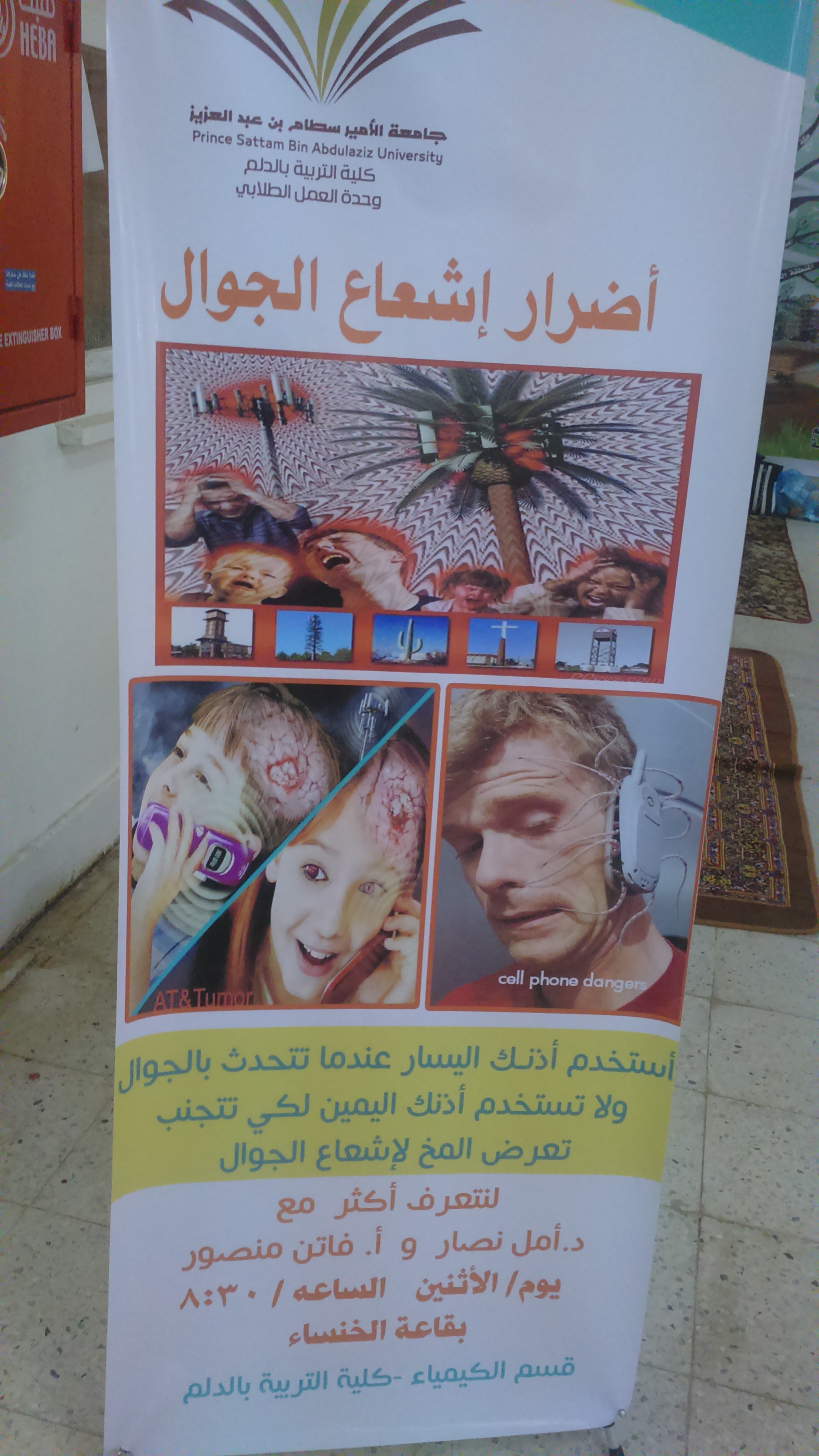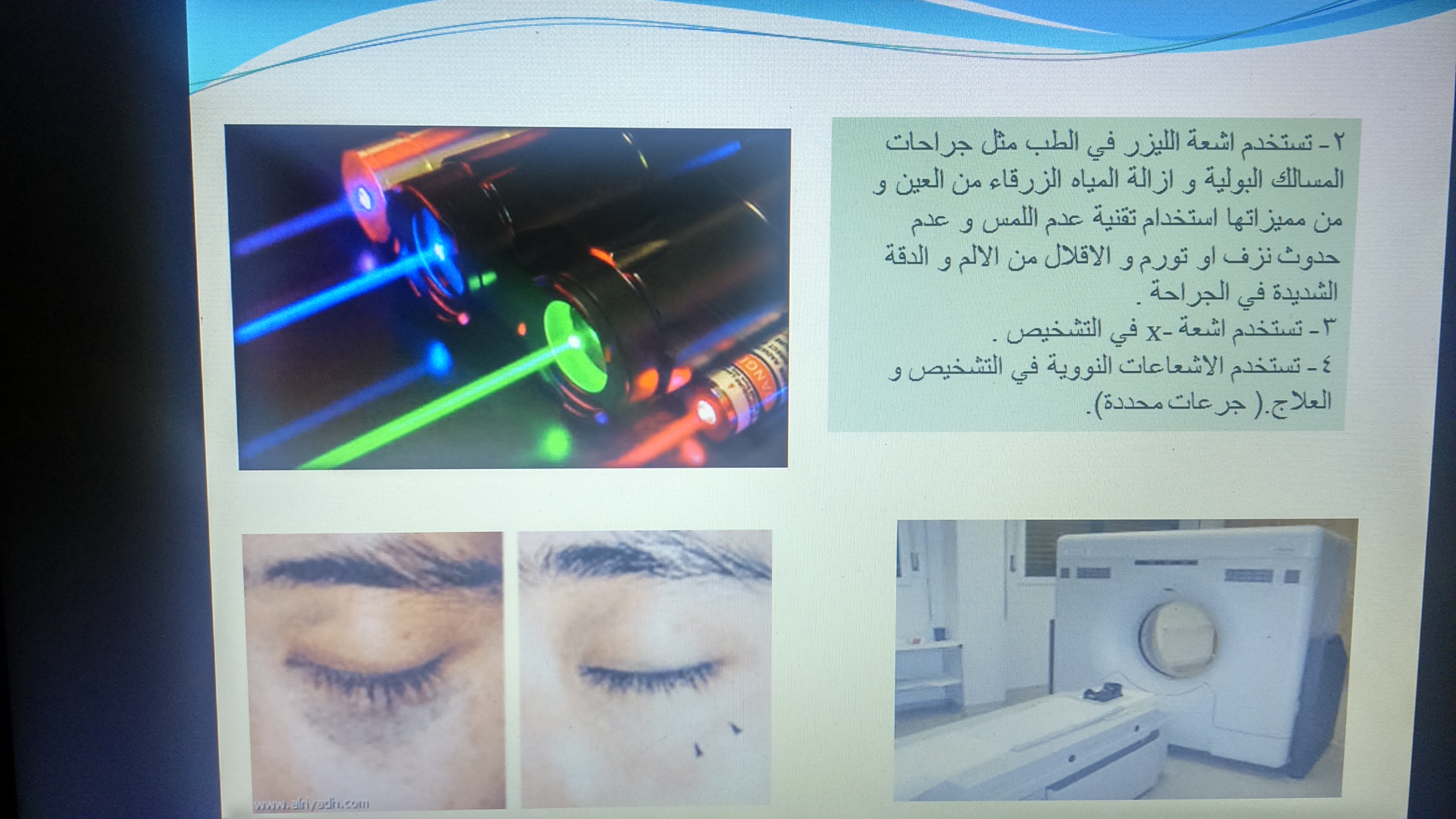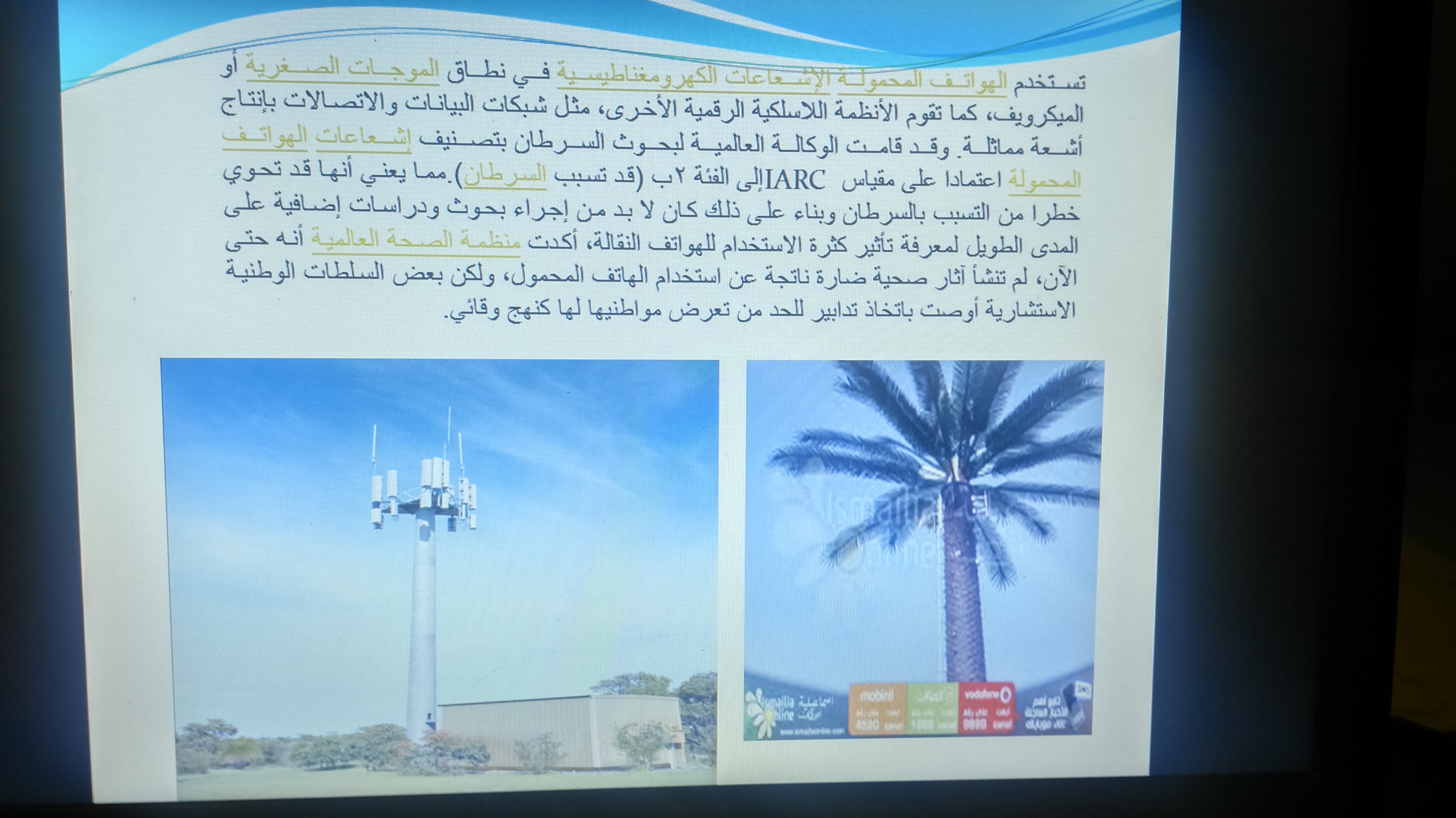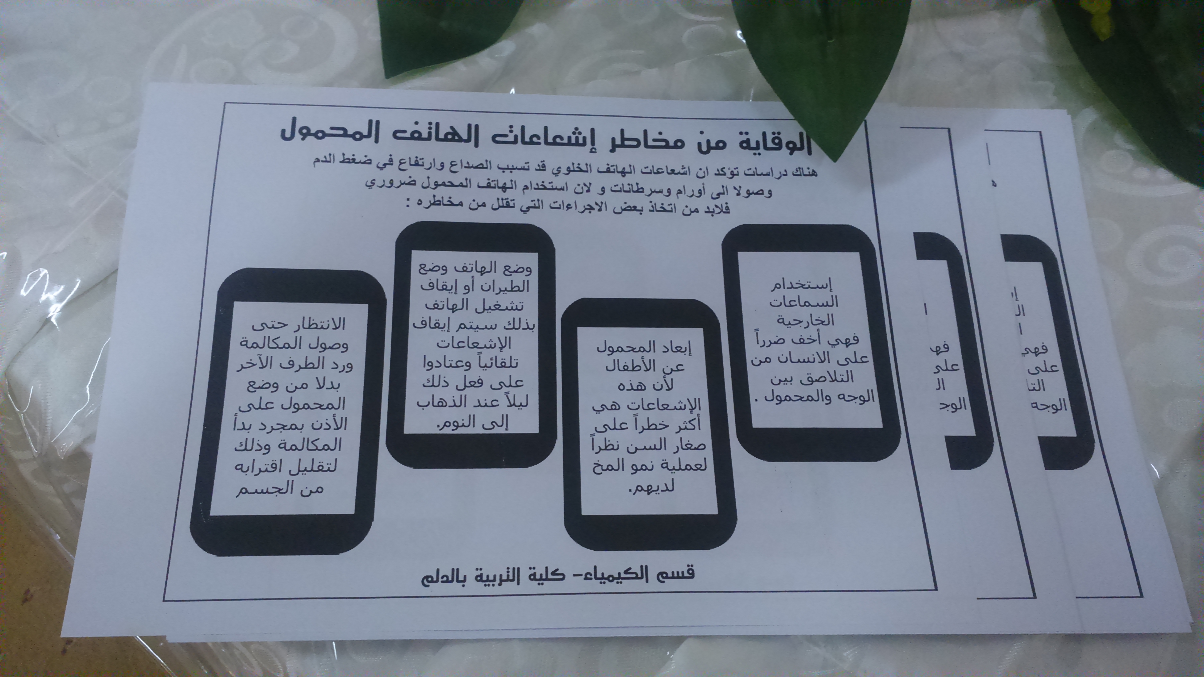 اشتملت المحاضرة على عروض للبورنت وفيديوهات ومطويات تبين مضار ومخاطر الإشعاعات .