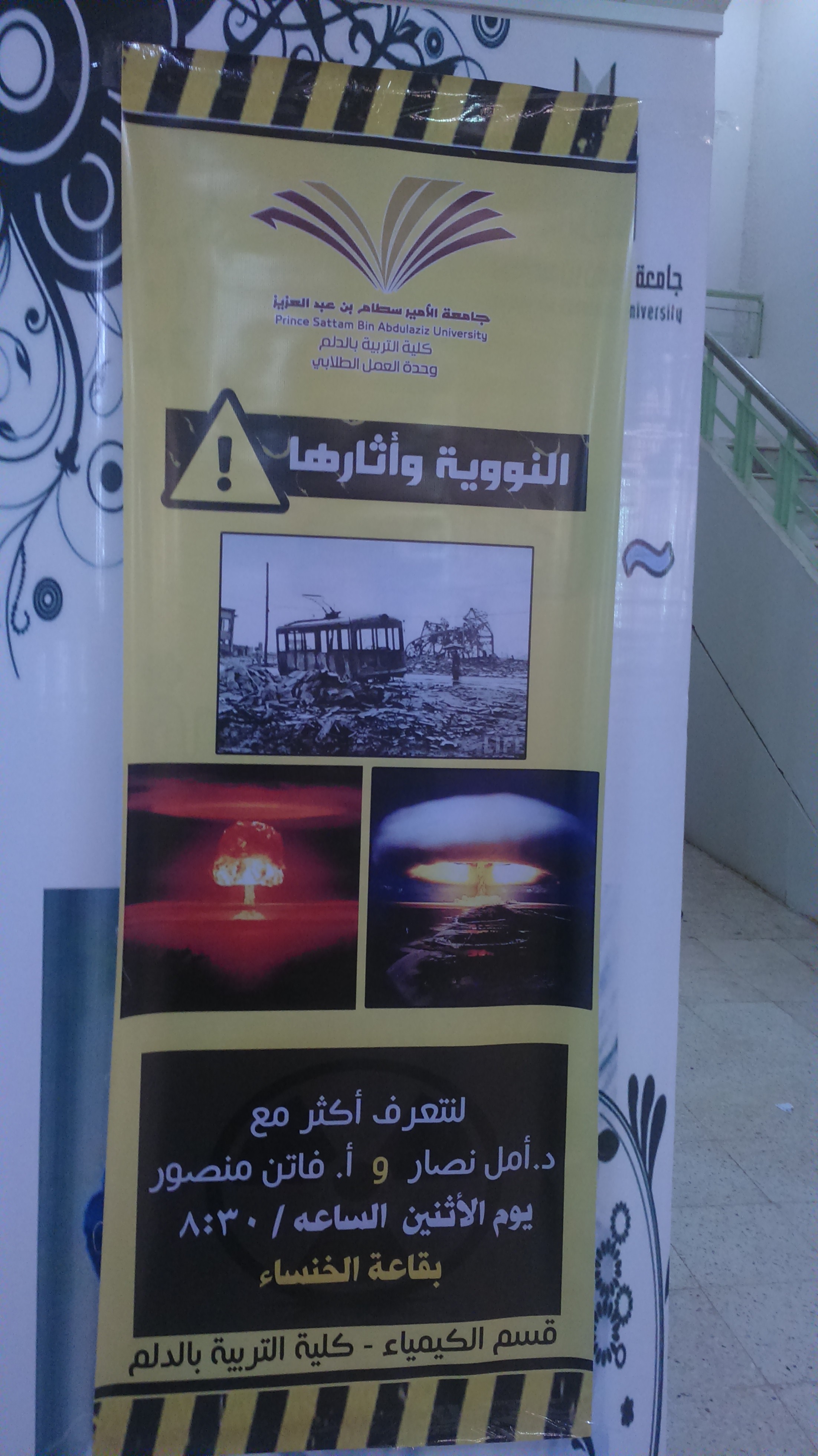 نظم قسم الكيمياء بكلية التربية بالدلم محاضرة بعنوان "الإشعاعات وأثارها" ألقتها : أ. فاتن منصور عضو هيئة التدريس بالقسم وبالتعاون مع د. أمل نصار مشرفة قسم الكيمياء يوم الأثنين الموافق 1437/1/20هـ الساعة الثامنة والنصف بقاعة الخنساء ، الفئة المستهدفة جميع منسوبات الكلية .