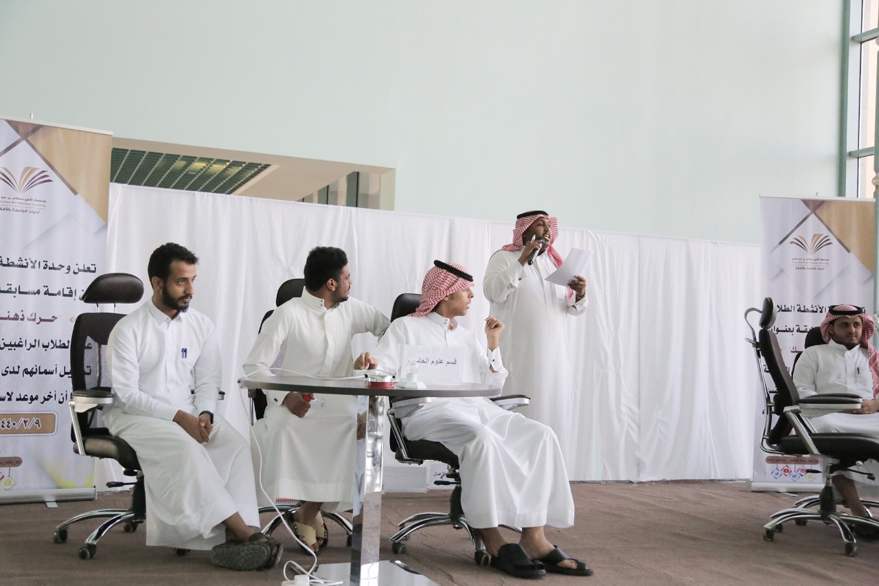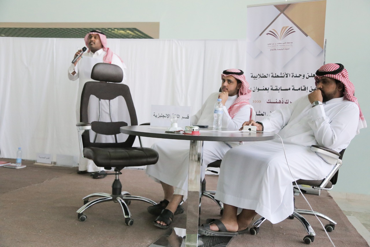 وكانت وحدة الأنشطة الطلابية ممثلاً بالقسم الثقافي بكليات الأفلاج قد اطلقت يوم أمس الثلاثاء مسابقة "حرك ذهنك" الثقافية بين الأقسام تأهل خلال المسابقة في التصفيات النصف النهائي قسم " الرياضيات" وقسم " اللغة الإنجليزية" تأهل بعدها قسم الرياضيات إلى النهائي وفي المقابل التقى قسم " الدراسات الإسلامية" مع قسم " القانون" تأهل فيها قسم " الدراسات الإسلامية"، وفي المباراة النهائية التقى قسم " الدراسات الإسلامية" مع قسم "الرياضيات" حصل فيها قسم " الدراسات الإسلامية" على المركز الأول بعد فوزه على قسم الرياضيات وتوج بجائزة المسابقة ، فيما حصل قسم الرياضيات على المركز الثاني في المسابقة .