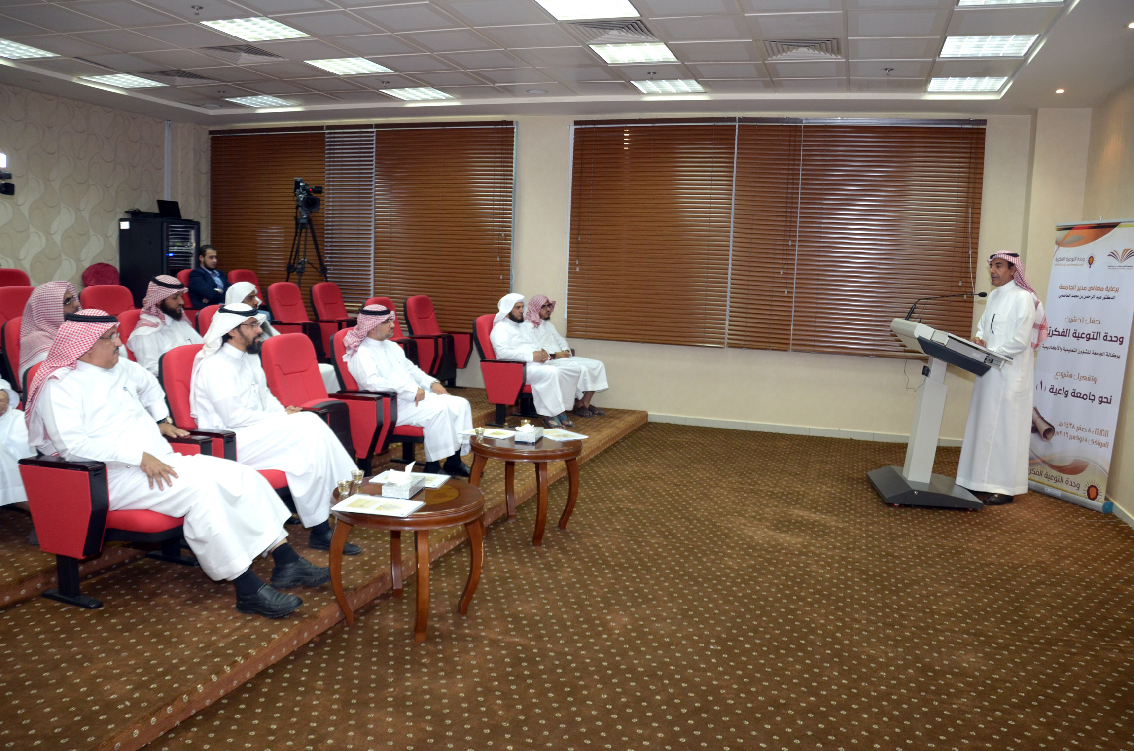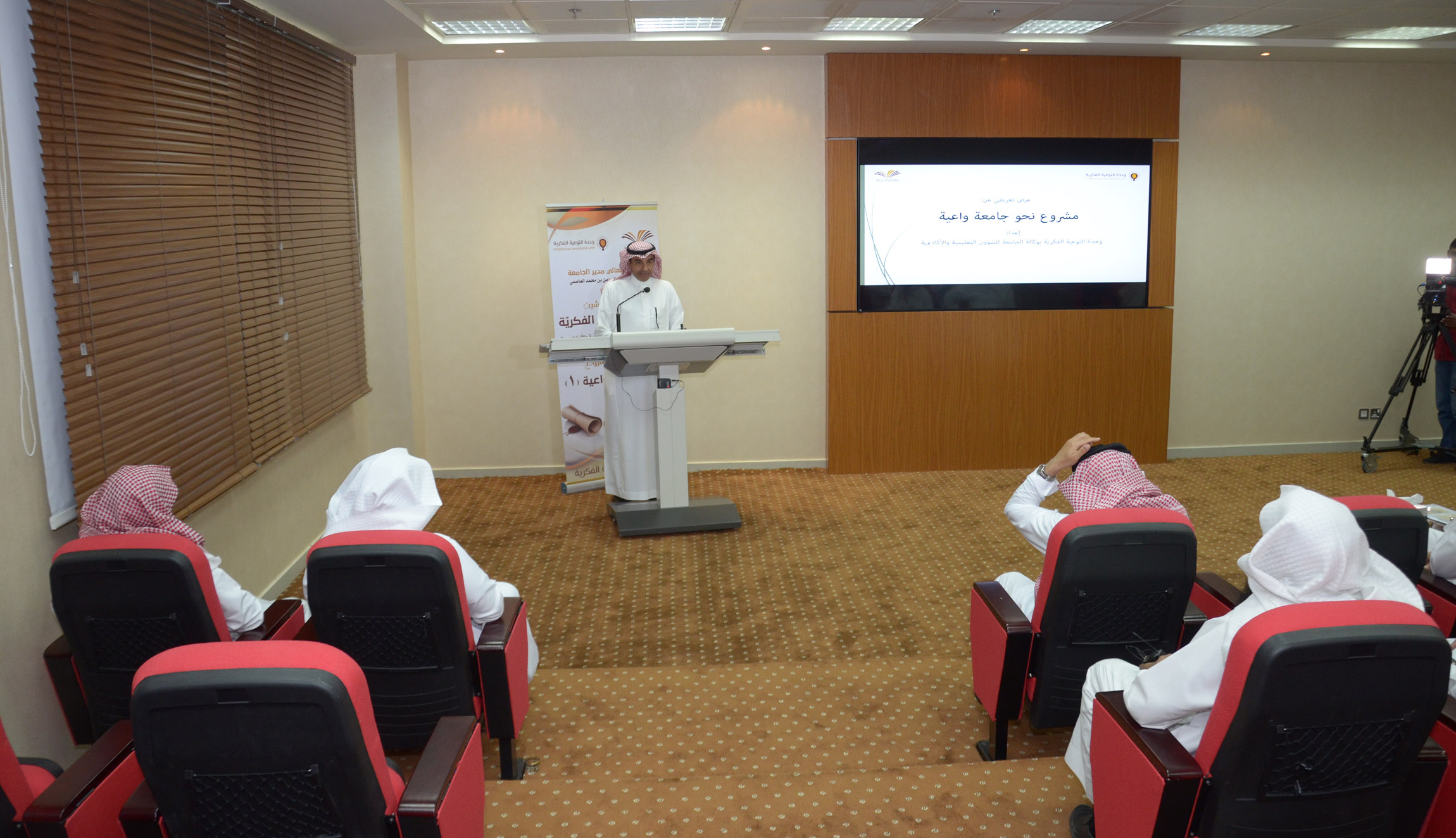 من جانبه قدّم الدكتور خالد الدبيّان المشرف على وحدة التوعية الفكرية عرضًا تقديميًّا بيّن فيه أهداف المشروع ورسالته، وبرامجه المتنوعة والتي تشمل الدورات التدريبيّة والمحاضرات التوعويّة، والندوات، والمسابقات الثقافية والإبداعيّة.