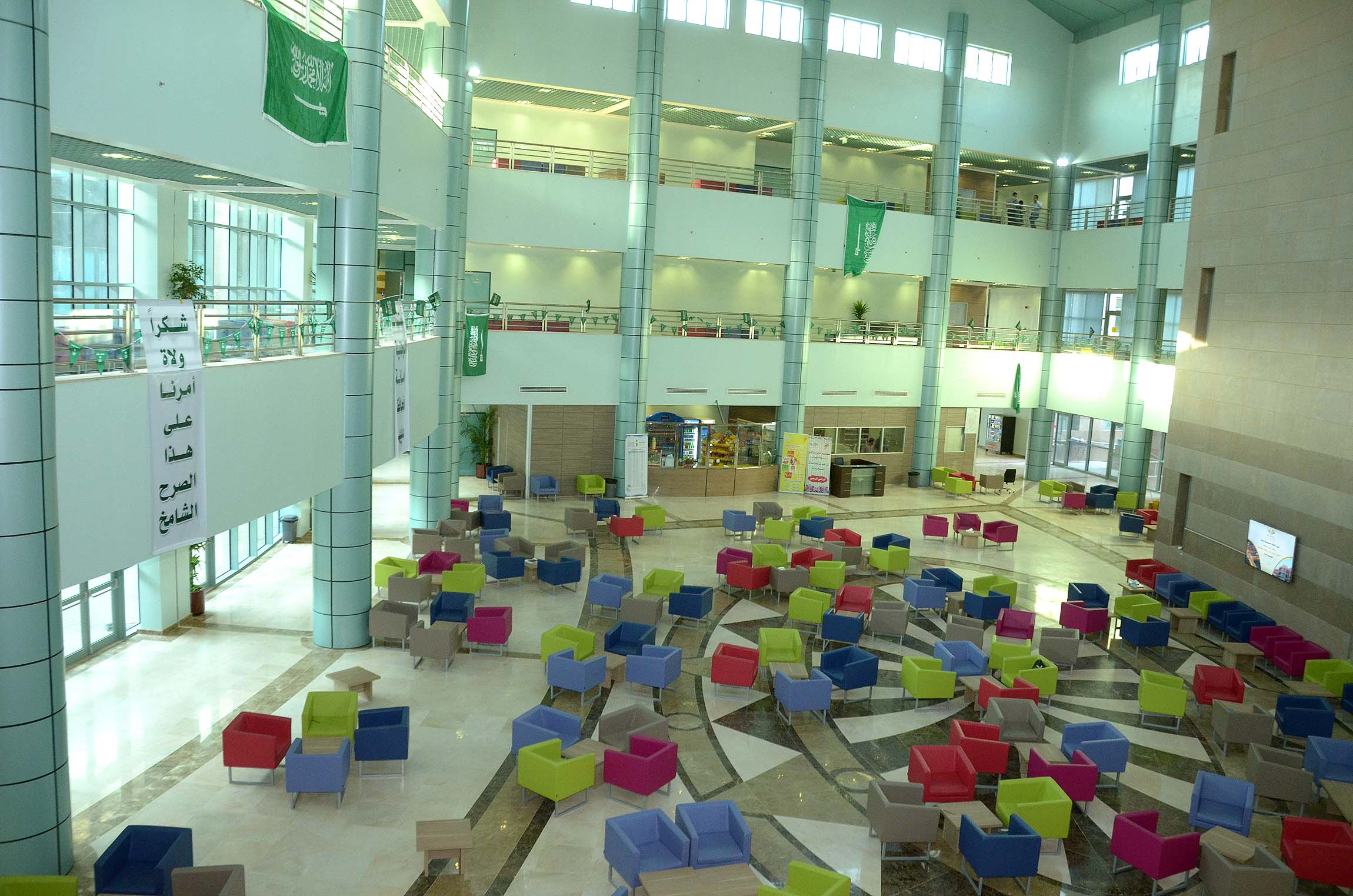 كما يتضمن المبني عدد (61) قاعة دراسية، و(133) مكتبًا إداريًّا، و(12) قاعة اجتماعات، ويتضمن المبنى مجموعة من الخدمات (كافتيريا - مكتبة - مصلى - مسرح - محلات بيع مستلزمات الطالب - عيادة طبية)، وقد تم تأثيث المبنى بعقد قيمته (25 مليون ريال) تقريبًا، ويشمل كل احتياجات الكلية من التجهيزات الحديثة؛ كما يشتمل الأثاث على تجهيز المعامل والقواطع والوسائل التعليمية الحديثة ومقاعد للطالبات واستراحات.