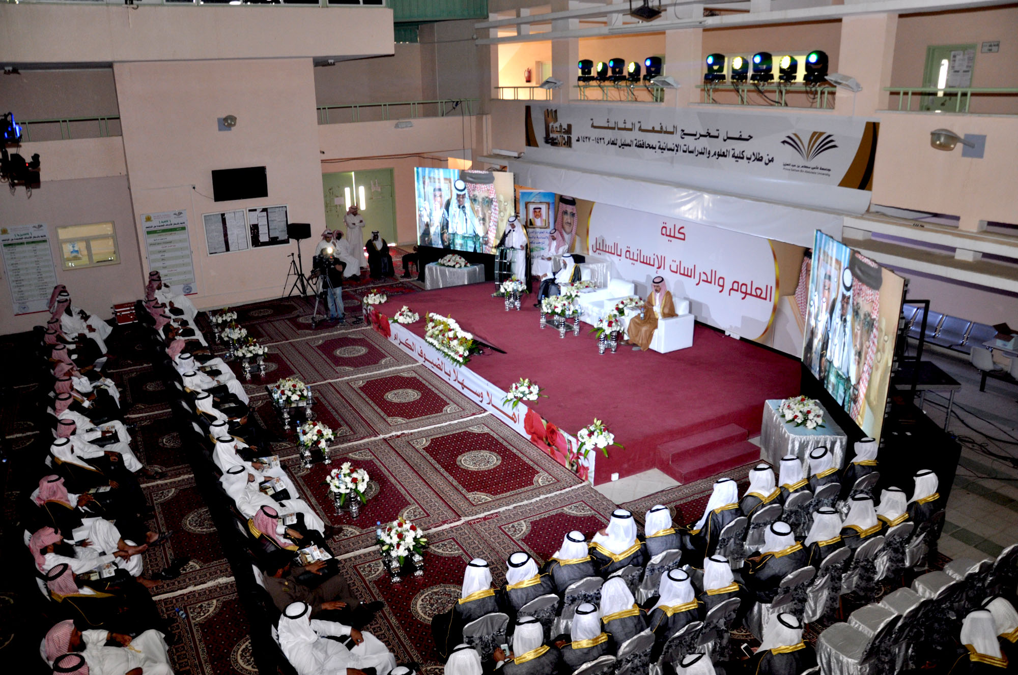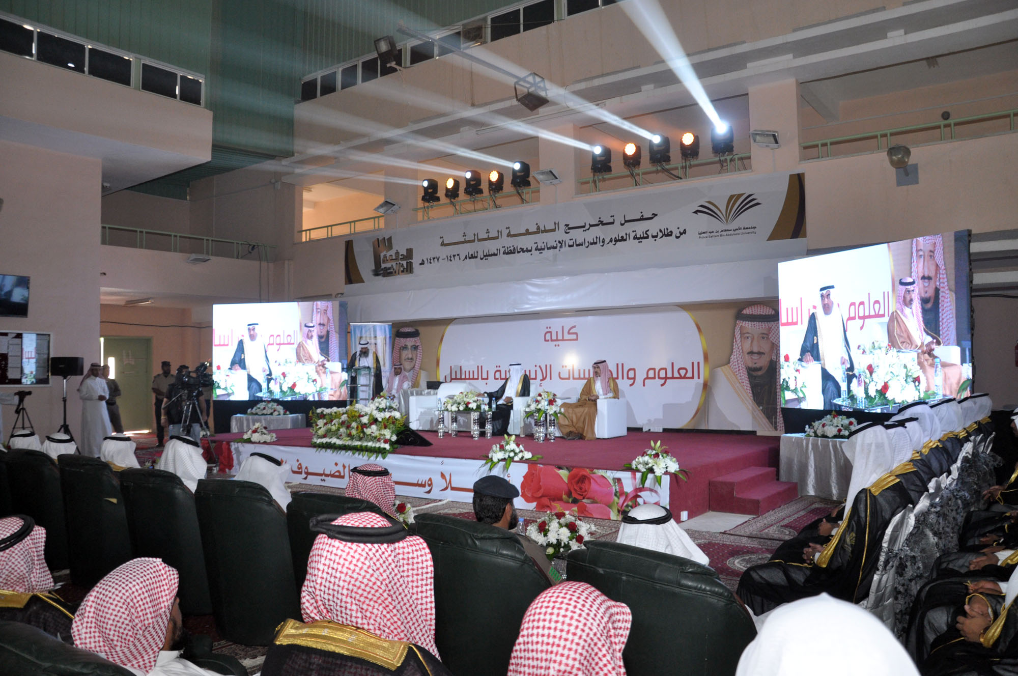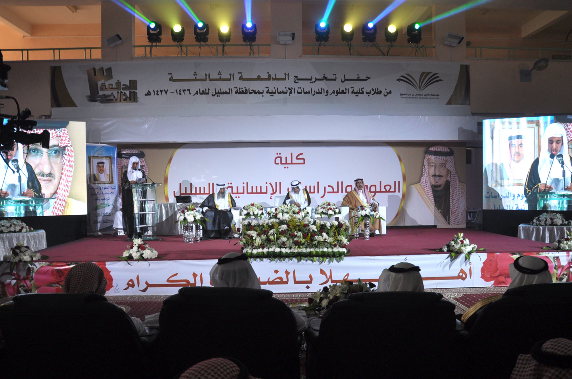 رعى مدير جامعة الأمير سطام بن عبدالعزيز الدكتور عبدالرحمن العاصمي، وبحضور محافظ السليل مساعد الماضي، وعميد الكلية الدكتور عبدالله الفالح، حفل تخريج الدفعة الثالثة من طلاب كلية العلوم والدراسات الإنسانية بالمحافظة والبالغ عددهم 210 طالبًا وطالبة، حيث أقيم حفل خطابي بهذه المناسبة بدأ بمسيرة الخريجين، تلا ذلك كلمة عميد الكلية رحب فيها بمعالي مدير الجامعة وقال: نحمد الله على أن منَّ على وطننا وطن الحزم والعزم من اتخاذ قياداتها الإسلام منهجاً لها ودستوراً، وأن هذه الجامعات والكليات المنتشرة في الوطن وتشع علماً ومعرفة ما هي إلا واحدة من المفاخر والإنجازات التي تستوجب شكر الله ثم القيادة، ثم هنأ الخريجين رجال المستقبل الذين سيسهمون في مسيرة التنمية للمملكة. منوهًا بجهود جامعة الأمير سطام بن عبدالعزيز منذ تأسيسها في خدمة الإسلام وشريعته وهذه البلاد وأهلها والمسلمين أجمعين.