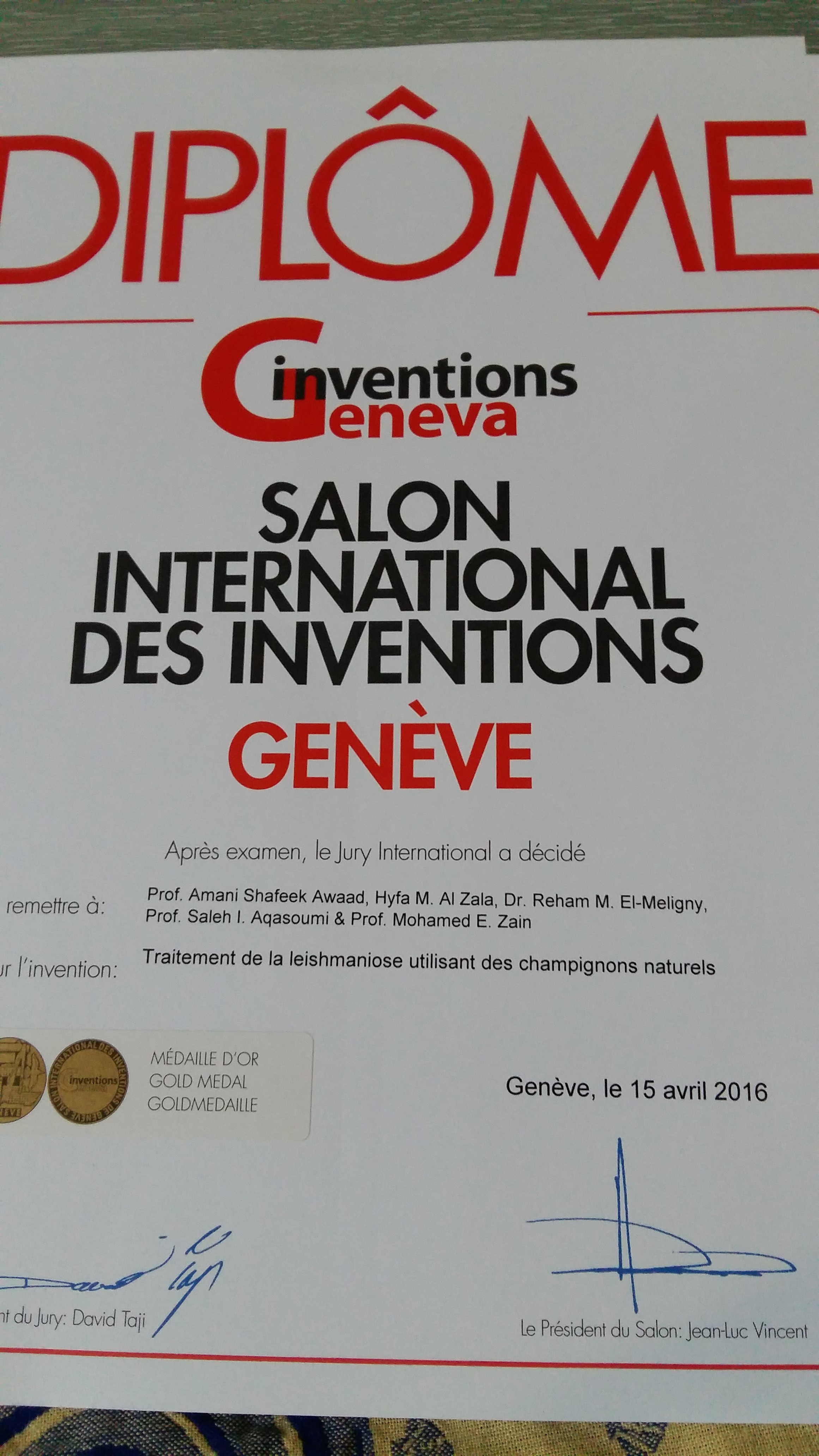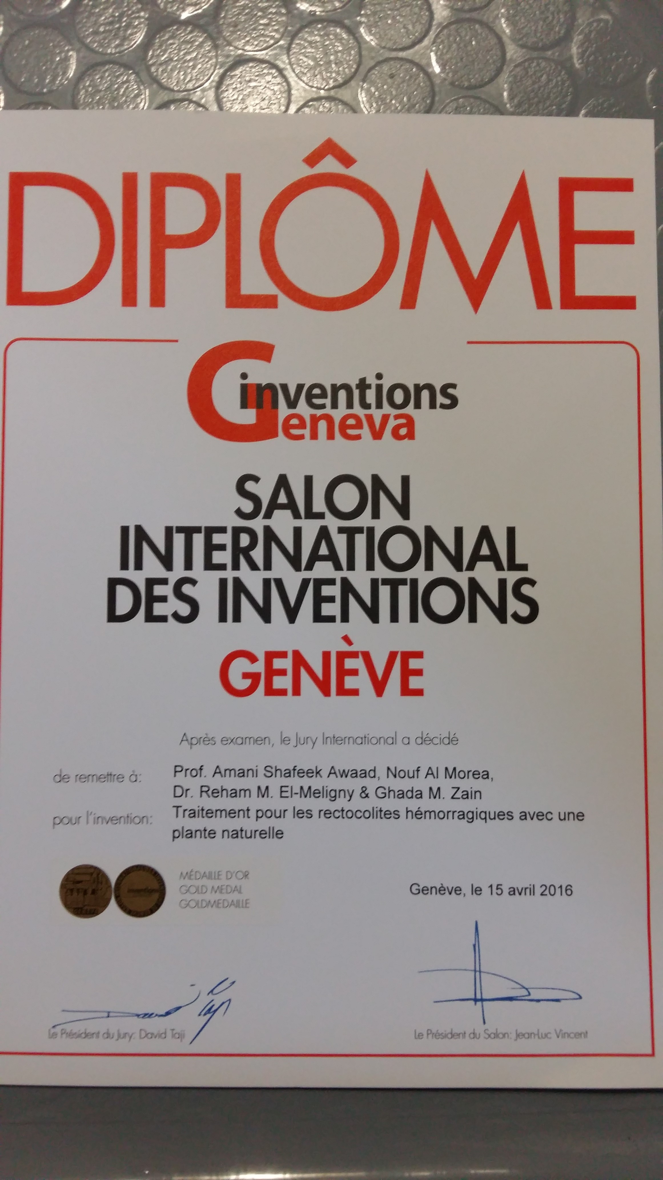 حصلت الأستاذة الدكتورة أماني عواد أستاذ العقاقير ومساعدة عميد كلية الصيدلة لشطر الطالبات بجامعة الأمير سطام بن عبدالعزيز على ميداليتين ذهبيتين بمعرض جنيف الدولي للإبتكارات(44) لعام 2016م