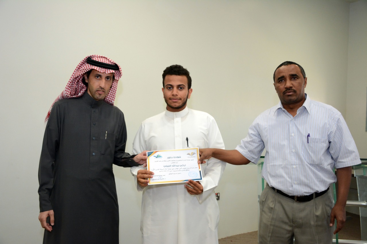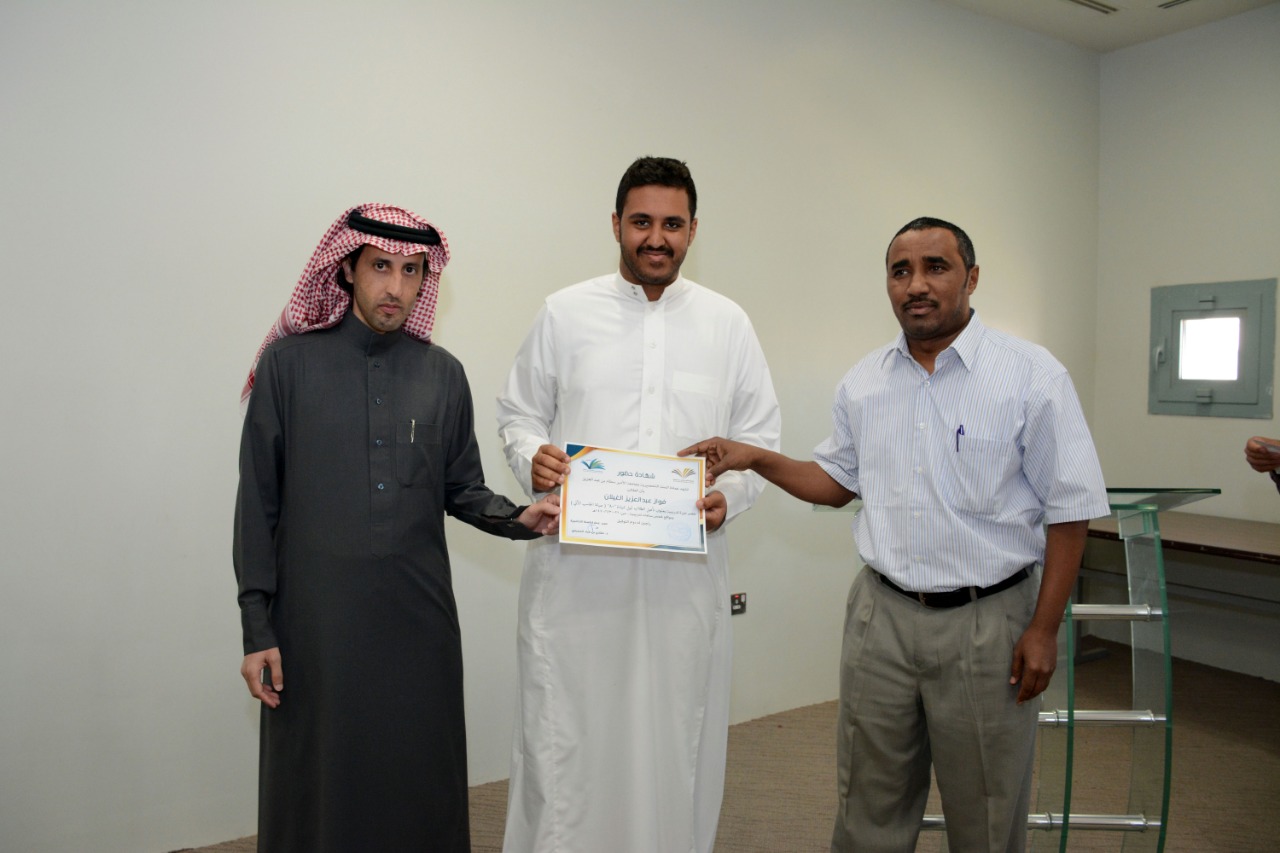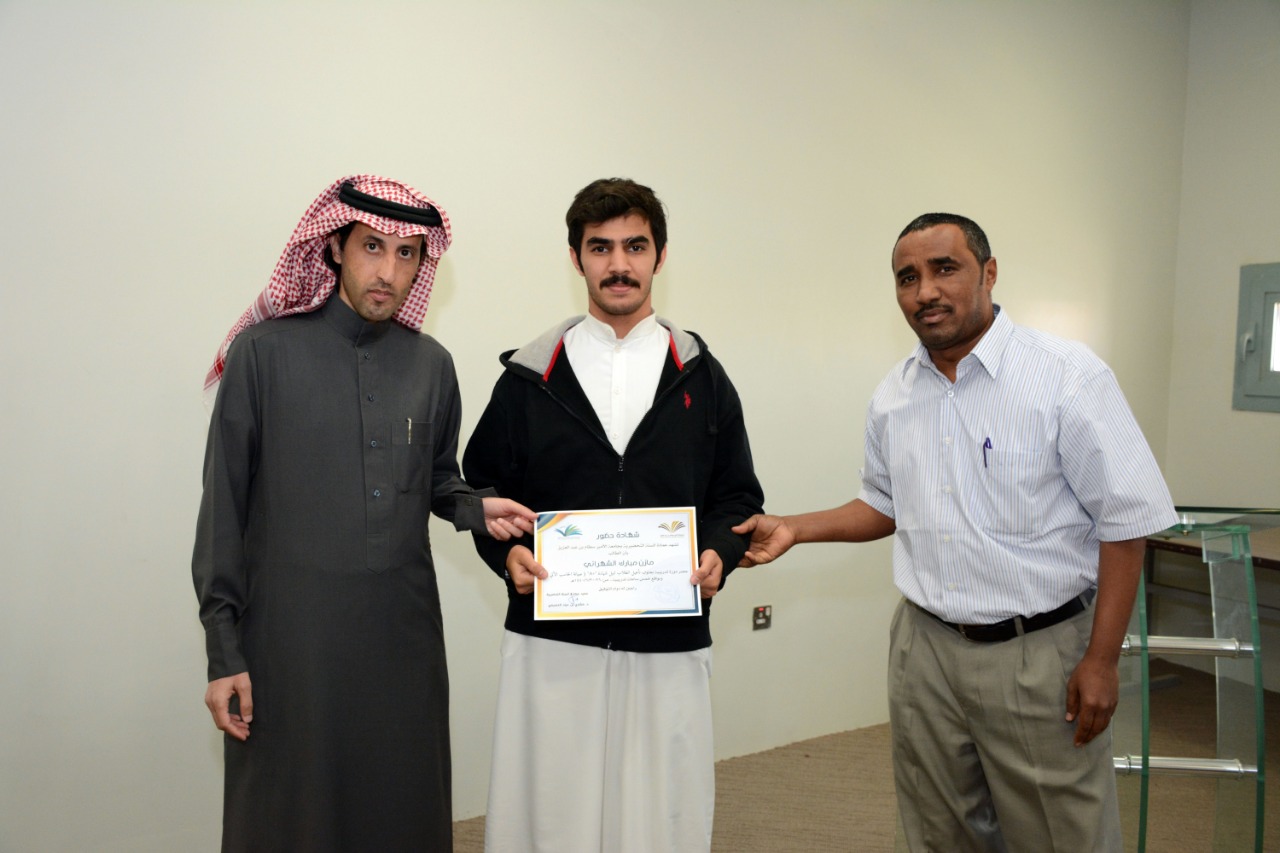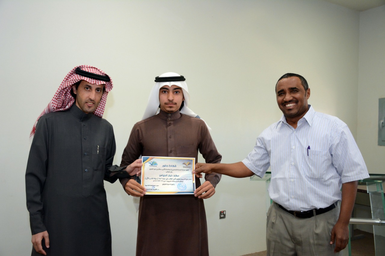 في ختام الدورة التدريبية : تأهيل الطلاب لنيل شهادة "+A" ( صيانة الحاسب الآلي )، كرّم وكيل العمادة الدكتور فهد بن شهيل العلوي اليوم الخميس: 30/6/1440هـ الطلاب الحاضرين للدورة ، وكان ذلك عقب عقب كلمة وجهها لهم شاكرا إياهم على حرصهم على حضور مثل هذه الدورات التي تقيمها العمادة والتي تخدم الطالب في مسيرته العلمية والمهنية ، مؤكدا على ضرورة الاستفادة من جميع الدورات وورش العمل والمحاضرات التي تعقدها الوحدات التعليمية بالتنسيق مع وحدة الأنشطة الطلابية في العمادة ،والتي ستنعكس على مستقبلهم العلمي بمشيئة الله تعالى. كما تقدم بشكرة لوحدة الحاسب وتطوير الذات بالعمادة وللقائمين عليها اختيارهم لهذه الدورة ، وتفضل مشكورا بتوزيع الشهادات على جميع الطلاب الحاضرين للدورة.