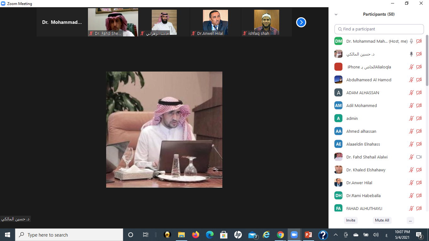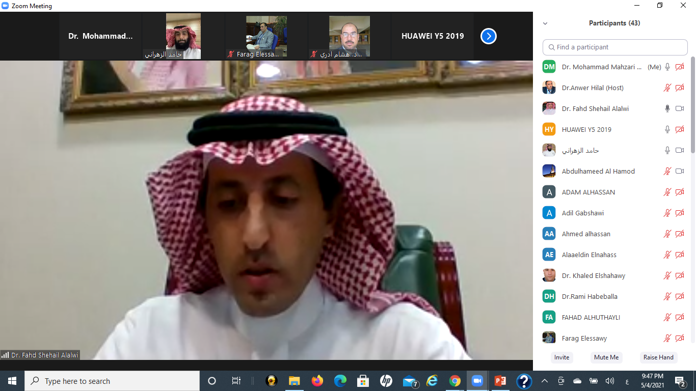 حيث بدأ اللقاء بكلمة راعي الحفل الدكتور فهد بن شهيل العلوي تحدث فيها عن التحديات التي واجهتها العمادة والاستطاعة على تجاوزها بنجاح في ظل الظروف التي اجتاحت العالم بسبب فيروس كورونا وكيف استطعنا بفضل الله أولاً ثم بوسائل التقنية وجهود جميع الزملاء من أعضاء هيئة تدريس وموظفين أن نكمل المسيرة التعليمية بكامل أدوات الجودة والاحترافية ..