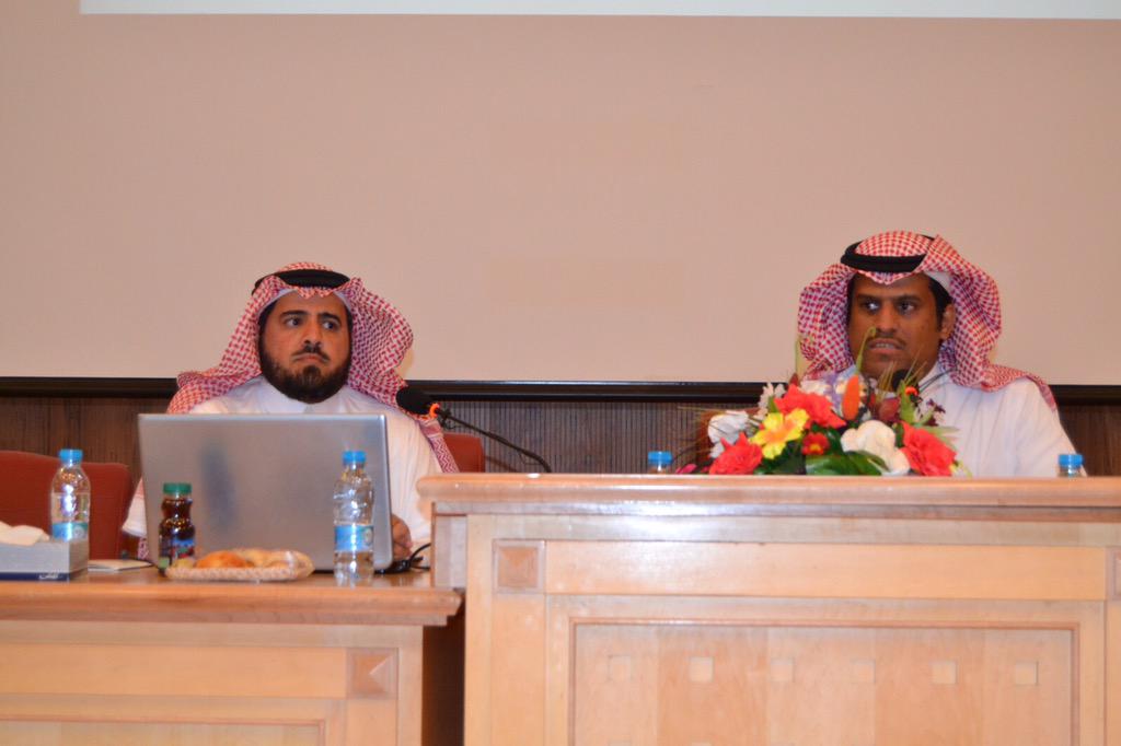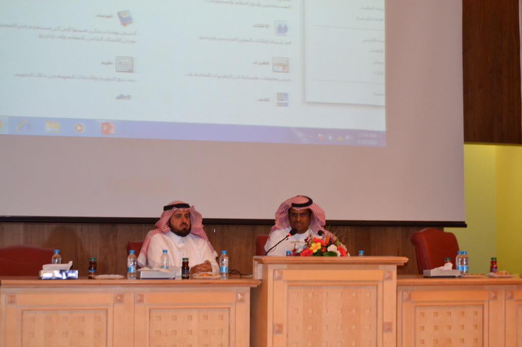 بعد ذلك بدأ سعادته عرضاً تقديمياً حول الخدمات الإلكترونية التي تقدمها الجامعة لطلابها، حيث شملت تلك الخدمات خدمة البريد الإلكتروني والخدمات الإلكترونية الأكاديمية مثل التسجيل والحذف والإضافة وبقية الحركات الأكاديمية التي يحتاجها الطالب في مسيرته التعليمية بالجامعة، وخدمات المكتبة ونظام التدريب الصيفي وخدمات الأنشطة الطلابية ونظام الدعم الفني وخدمات الشبكة اللاسلكية، مركزا سعادته على بوابة التعلم الإلكتروني التي تشمل أشهر نظم إدارة التعلم الإلكتروني (بلاك بورد) والذي يقدم حزمة من الخدمات للطالب وعضو هيئة التدريس منها خدمة الفصول الافتراضية وخدمة الاختبارات الإلكترونية ويوفر المحتويات الالكترونية والواجبات بالإضافة الى توفير منصة للنقاشات والإعلانات الدراسية، داعيا كافة الطلاب للاستفادة من هذه النظم والخدمات تيسيرا لهم ومواكبة لعصرهم الذي يعيشونه مع التقنية.