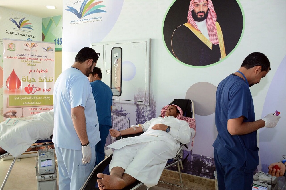 بالتعاون مع مستشفى القوات المسلحة ، دشن الدكتور مشاري بن عياد العصيمي عميد عمادة السنة التحضيرية بجامعة الأمير سطام بن عبدالعزيز وسعادة اللواء الطبيب نامي بن فوزان الجعيد مدير مستشفيات القوات المسلحة بالخرج ، وبمرافقة سعادة وكيل العمادة للشؤون التعليمية والأكاديمية الدكتور فهد بن شهيل العلوي وسعادة مشرف المختبرات بإدارة مستشفيات القوات المسلحة بالخرج العميد فهد بن صالح الجويعي والكادر المرافق من المستشفى حملة "قطرة دم تنقذ حياة" للتبرع بالدم، اليوم الأحد الموافق 2/6/1439هـ في مبنى العمادة بالمدينة الجامعية ، شارك فيها طلاب ومنسوبو السنة التحضيرية. وتستهدف الحملة أيضا جميع طلاب ومنسوبي الجامعة.