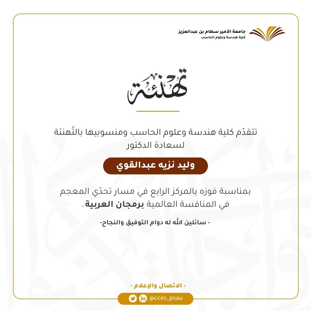 تبارك كلية الهندسة وعلوم الحاسب لعضو هيئة التدريس الدكتور وليد نزيه عبدالقوي على الفوز بالمركز الرابع في مسار تحدي المعجم في برمجان العربية التي لفريق ابن سيده أُقيم في مجمع الملك سلمان العالمي للغة العربية تحت رعاية صاحب السمو الأمير بدر بن عبدالله بن فرحان وزير الثقافة رئيس مجلس أمناء المجمع، وكان التحدي الأبرز على مستوى العالم في معالجة اللغة العربية آلياً الذي أطلقه مجمع الملك سلمان لأجل ابتكار حلول تقنيه ومنصات رقمية.