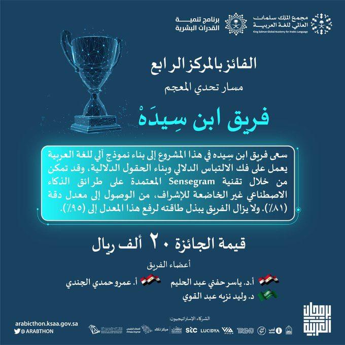 ضمن فريق ابن سيده حيث سعى الفريق في هذا المشروع إلى بناء نموذج آلي للغة العربية يعمل على فك الالتباس الدلالي وبناء الحقول الدلالية، وقد تمكن من خلال تقنية Sensergram المعتمدة على طرائق الذكاء الاصطناعي غير الخاضعة للإشراف، من الوصول إلى معدل دقة (٨١٪). ولايزال الفريق يبذل طاقته لرفع هذا المعدل إلى (٩٥٪)، ونُبارك لفريق الفوز بالمركز الرابع في مسار المعجم في برمجان العربية، ونُشِيد بجهودهم المتميزة ومبادرتهم المثمرة في تعزيز مكانة اللغة العربية عالميًّا.