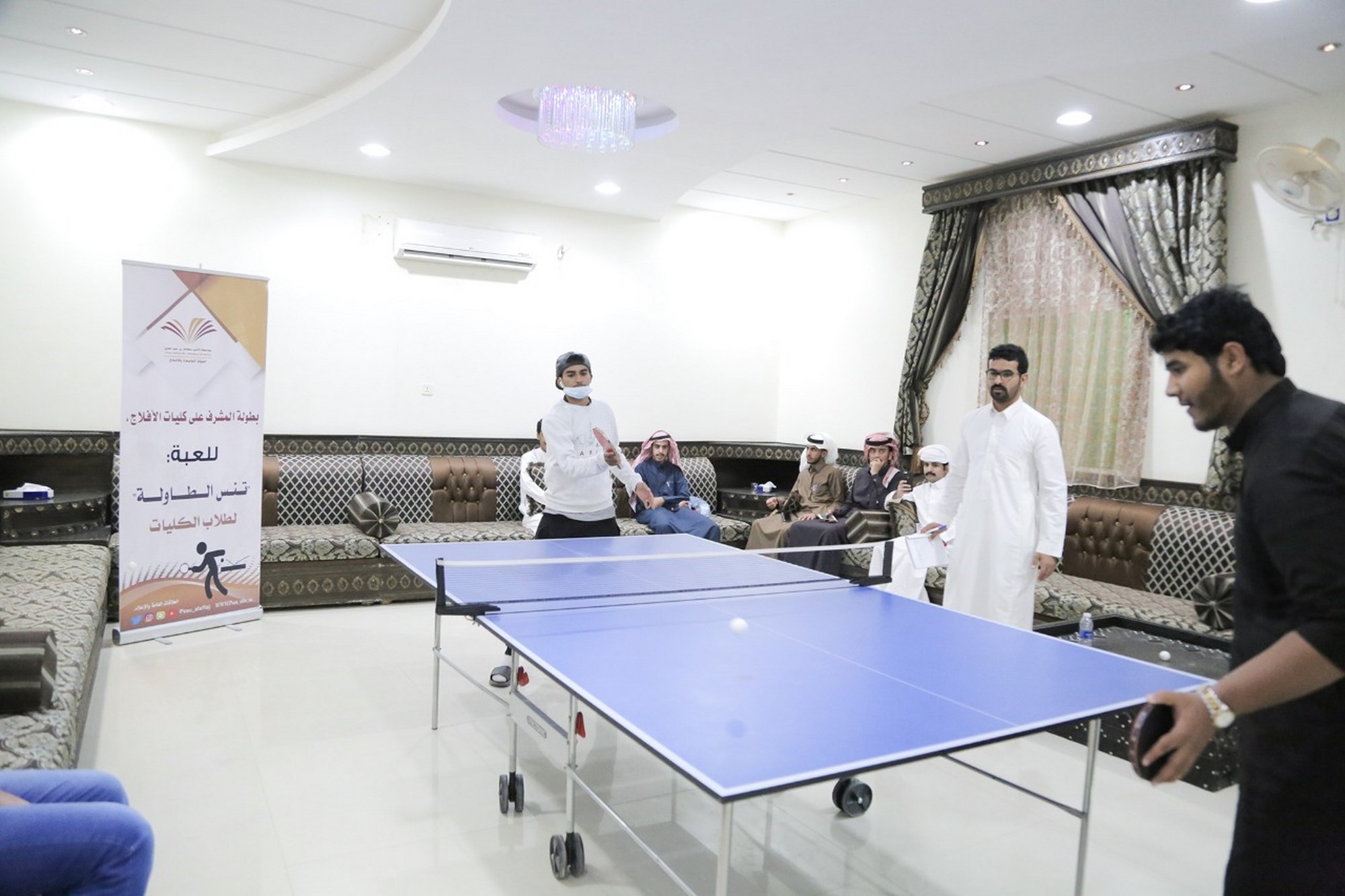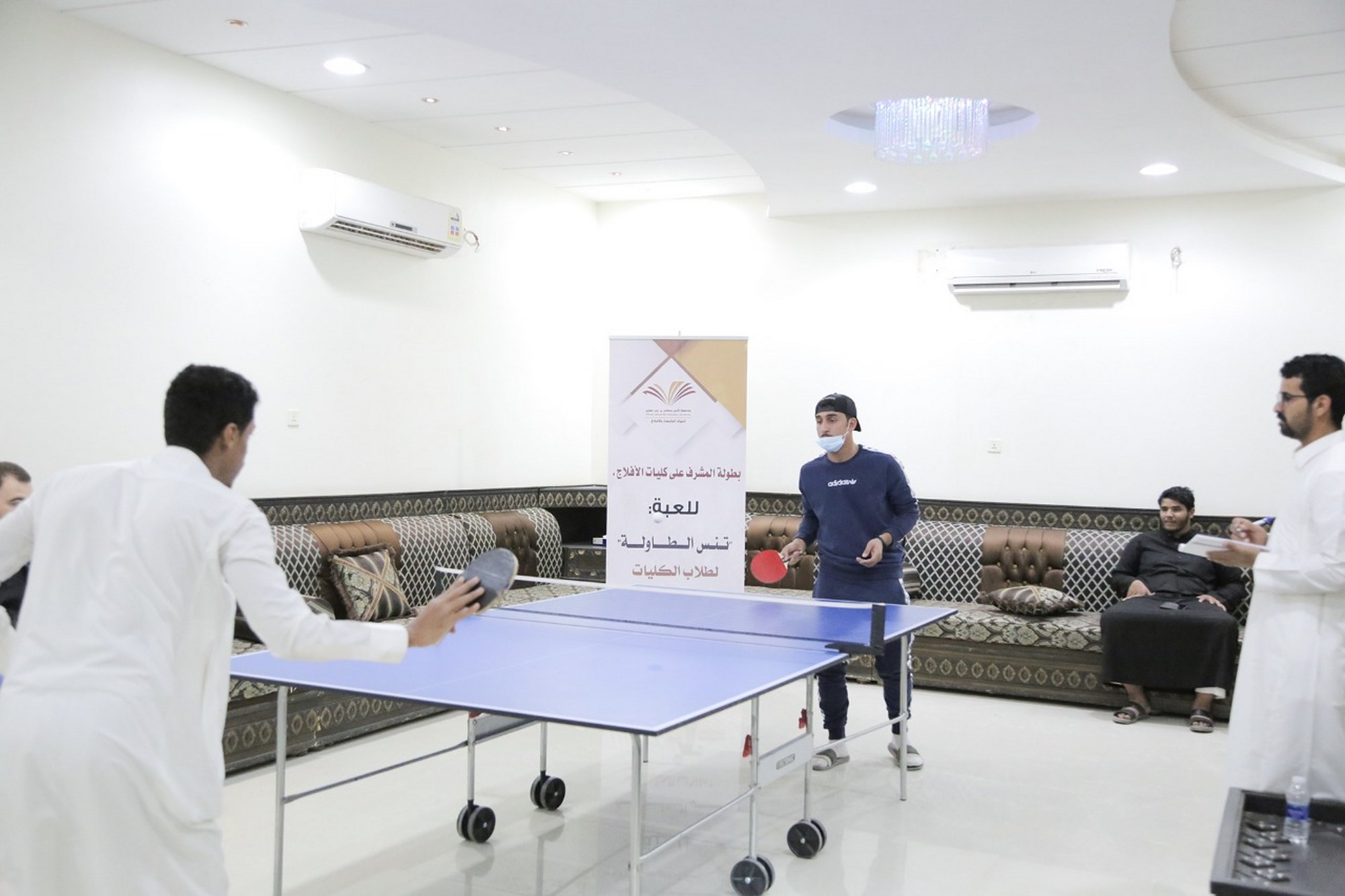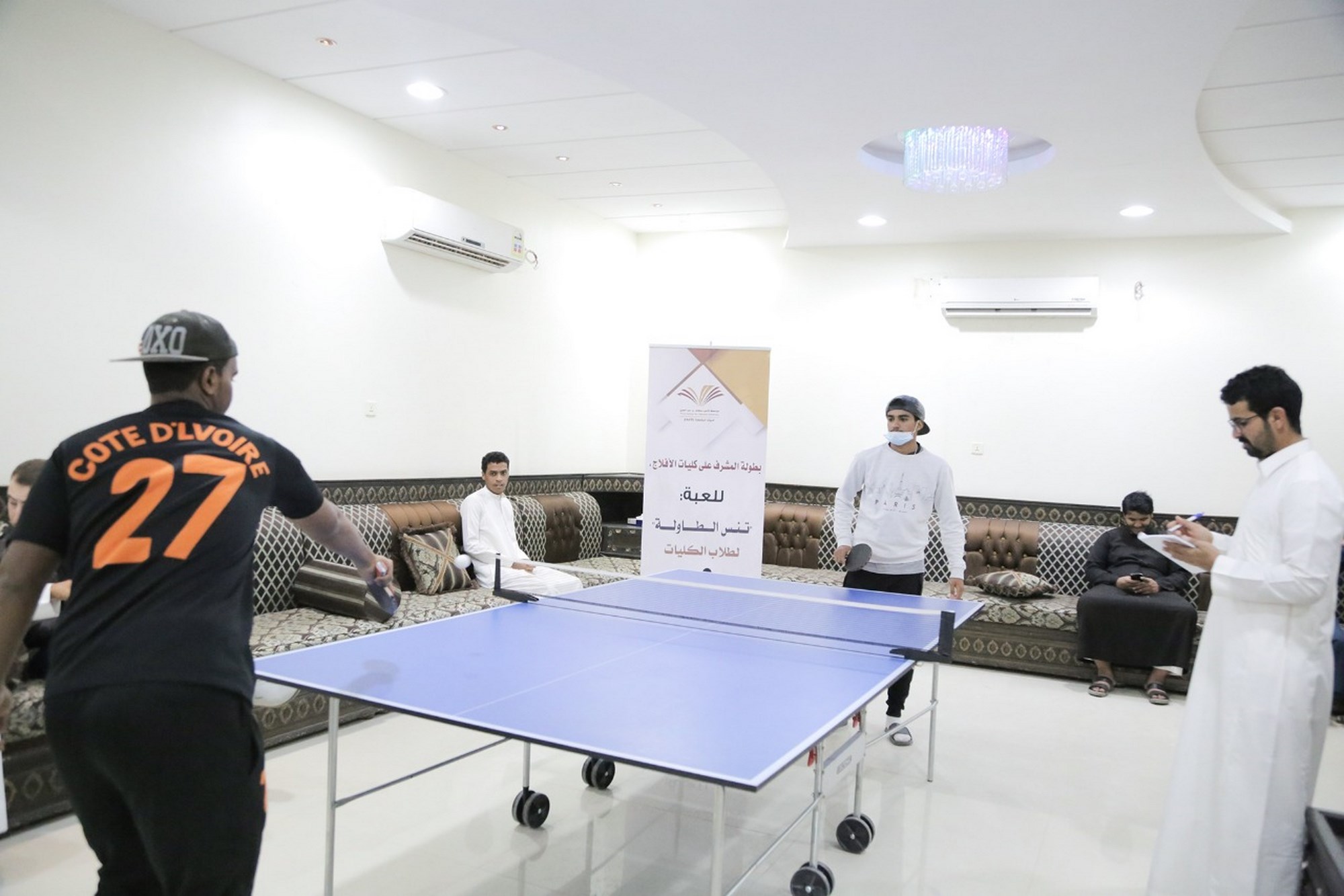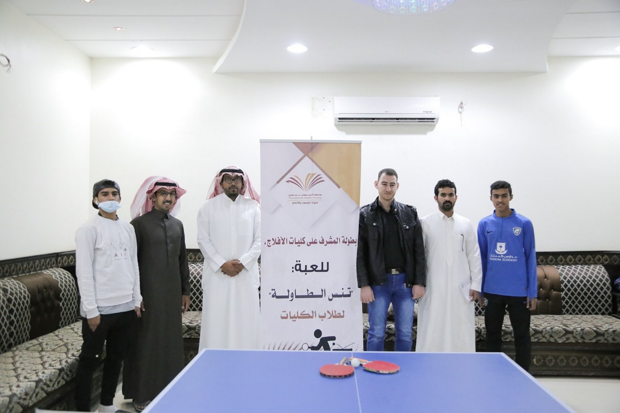 بمشاركة اثنى عشر طالباً من مختلف الأقسام نظمت كليات الجامعة بالأفلاج يوم الأثنين 1440/5/22 هـ بطولة "مشرف كليات الأفلاج" لتنس الطاولة التي نظمها القسم الرياضي .