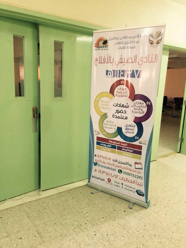 بتوجيه من سعادة الدكتور مسفر الكبيري عميد شؤون الطلاب، وتنفيذًا لآليات المتابعة والدعم، زار فريق الأندية الصيفية بقسم الطالبات بعمادة شؤون الطلاب، يرأسه وكيلة عمادة شؤون الطلاب الدكتورة دلال المطرفي، الناديَ الصيفيَّ بكلية العلوم والدراسات الإنسانية بالأفلاج، يوم الثلاثاء الموافق ١٠/٢١/ ١٤٣٧.وتأتي هذه الزيارة لمتابعة وملاحظة سير البرامج والفعاليات، ومدى نجاحها، ورضا المشاركات عنها، وأثرها فيهن.واطلع الفريق الزائر على ملفات النادي لتقييمها. علمًا بأن متابعة الأندية بفروعها الخمسة مستمرة بشكل يومي عبر التواصل الهاتفي والبريد الإلكتروني، وتبادل الوثائق كافة المتعلقة بالنادي.وفي نهاية الزيارة عبرت وكيلة عمادة شؤون الطلاب والفريق المرافق عن شكرهم الجزيل وتقديرهم العظيم لإدارة النادي ممثلة بالمشرفة عليه الأستاذة روان الكبيري على ما بذلنه من جهد واضح وملموس لإنجاحه.الجدير بالذكر هنا أن الأستاذة الكبيري من الكفاءات المميّزة في إدارة نادي الأفلاج للسنة الثالثة على التوالي.