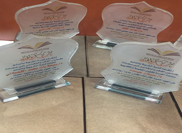 وفي نهاية الحفل قامت عميدة الكلية د/مليحة القحطاني بتقديم الدروع وشهادات الشكر والتقدير لكل من قامت بجهد مميز من منسوبات الكلية من الوكيلات وأعضاء هيئة التدريس والإداريات لإنجاح المسيرة التعليمية والإدارية بالكلية ، كما كرّمت عميدة الكلية أيضا عضوات هيئة التدريس من المتعاقدت والمنتهية عقودهن هذا العام تقديرًا ووفاءً لما بذلوه من جهود كبيرة أثناء فترة عملهم بالكلية و قدّمت لهن الشكر والتقدير على حسن أدائهن خلال مسيرتهن التعليمية وتميزهن في تنفيذ الأعمال الموكلة إليهن بكل كفاءة واقتدار، وقد ثمّنت عضوات هيئة التدريس المكرمات هذا التكريم وعبرن عن عميق امتنانهن وشكرهن لهذا البلد الكريم.