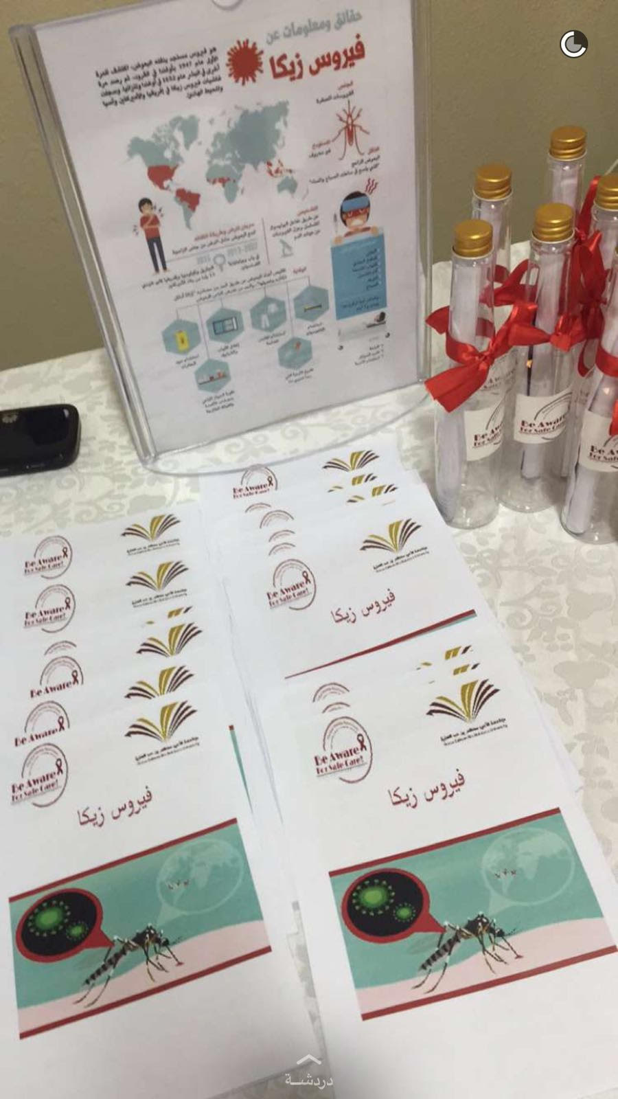 نظمت وحدة خدمة المجتمع بقسم العلاج الطبيعي الحملة التوعوية للوقاية من فيروس" زيكا وايبولا " يوم الاثنين الموافق 27/5 من الساعه ١٠إلى ١٢ظهرًا في ساحة الكلية شرحن فيه عن تاريخ انتشار الفيروس وأعراضه وآثاره وطرق الوقاية منه وعلاجه عن طريق عرض فيديو وتوزيع المنشورات وكانت الحملة التوعوية تحت إشراف المحاضر :حميراء عبد الرب خان من قسم العلاج الطبيعي ،بحضورعدد من أعضاء هيئه التدريس والطالبات