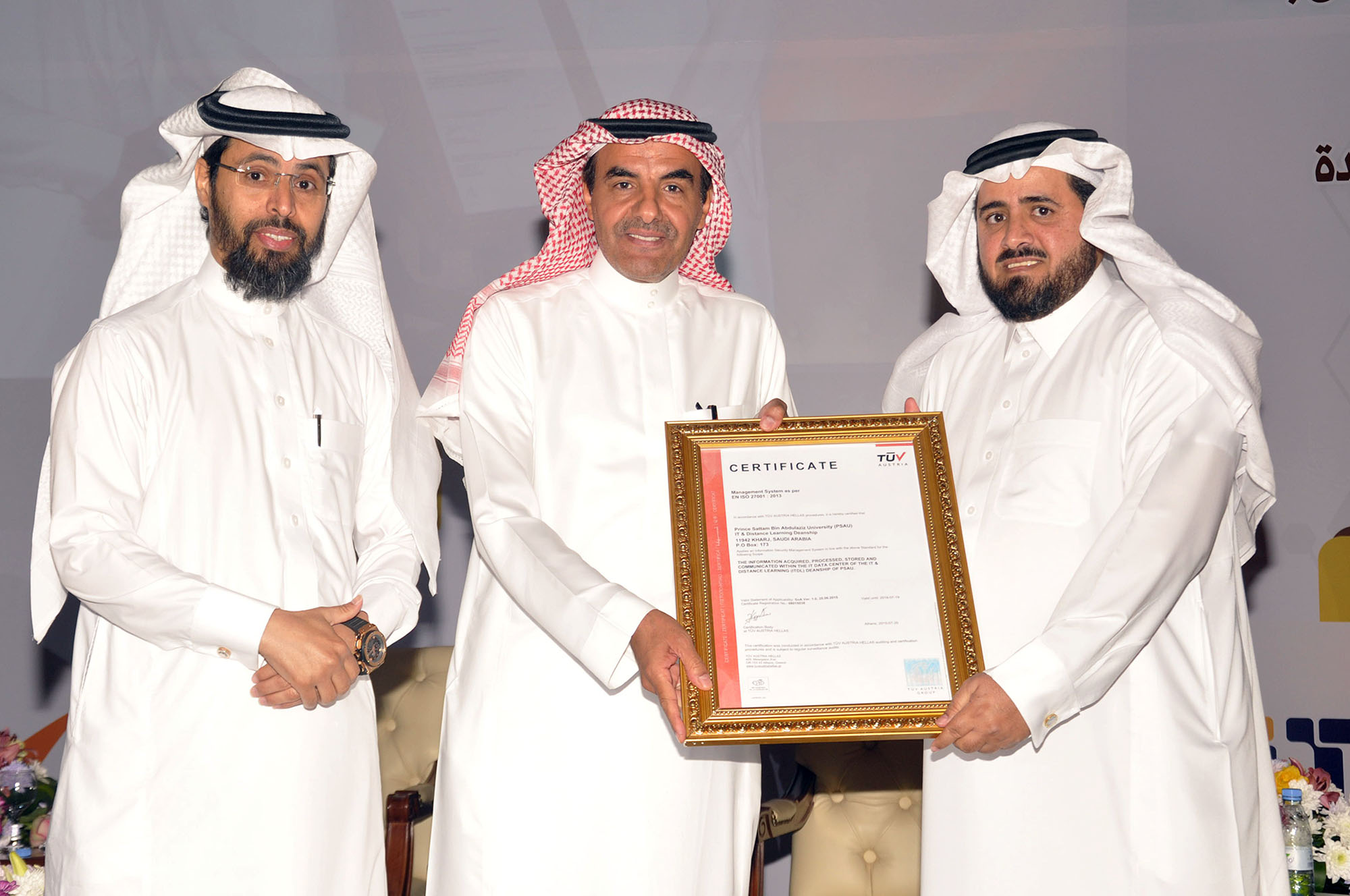 بعد ذلك قام الدكتور محمد بن سعيد القحطاني بتسليم معالي مدير الجامعة شهادة الآيزو٢٧٠٠١ المعروفة في تطبيق سياسات أمن المعلومات.