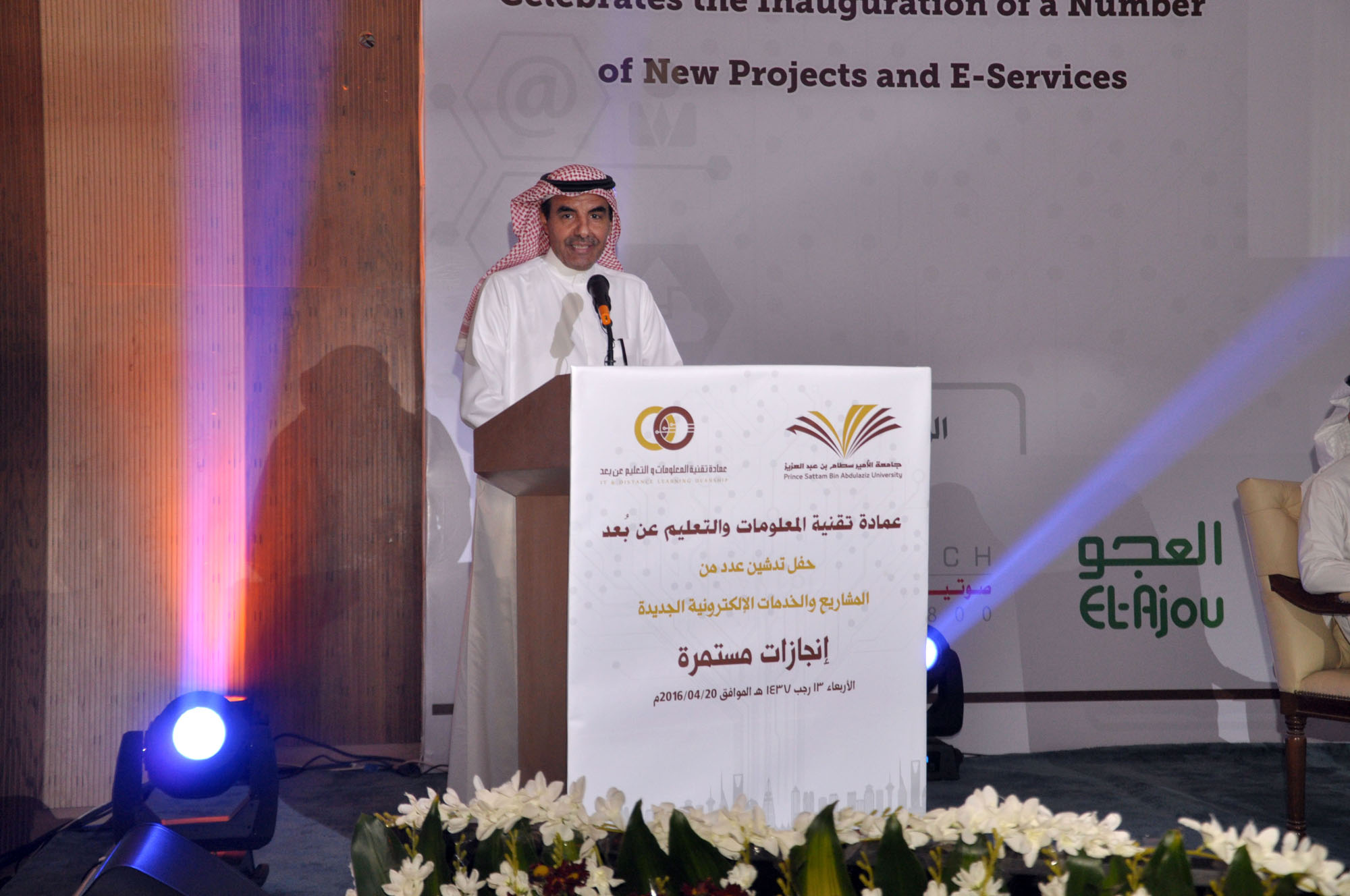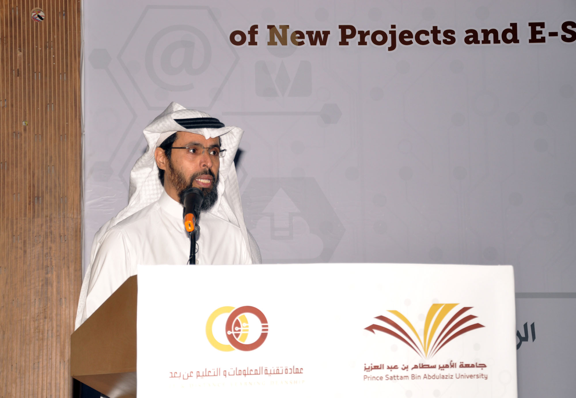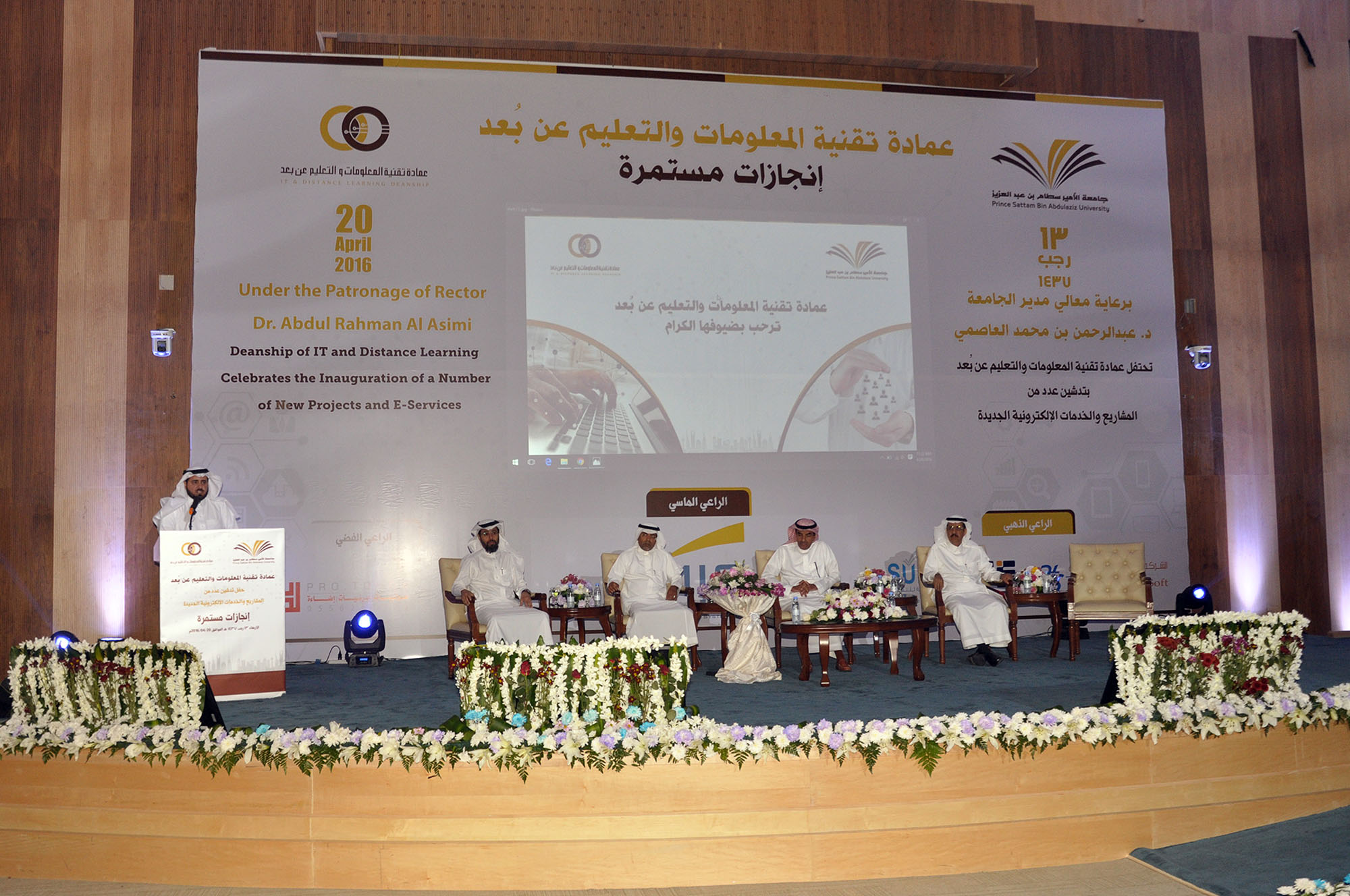 دشن معالي مدير جامعة الأمير سطام بن عبد العزيز الدكتور عبدالرحمن بن محمد العاصمي حزمة جديدة من المشاريع والخدمات الإلكترونية التي انتهت منها مؤخراً عمادة تقنية المعلومات والتعليم عن بُعد، وذلك في مسرح الجامعة الرئيس في المدينة الجامعية يوم الأربعاء 13 رجب 1437هـ. وقد أقامت العمادة بهذه المناسبة حفلاً حضره وكلاء وعمداء الجامعة ومدير عام برنامج التعاملات الإلكترونية الحكومية "يسِّر" سعادة الدكتور عبدالرحمن بن سليمان العريني والمشرف العام على المركز الوطني للتصديق الرقمي الدكتور فهد بن عبدالله الحويماني وعدد من ضيوف الجامعة ومن أعضاء هيئة التدريس والموظفين.