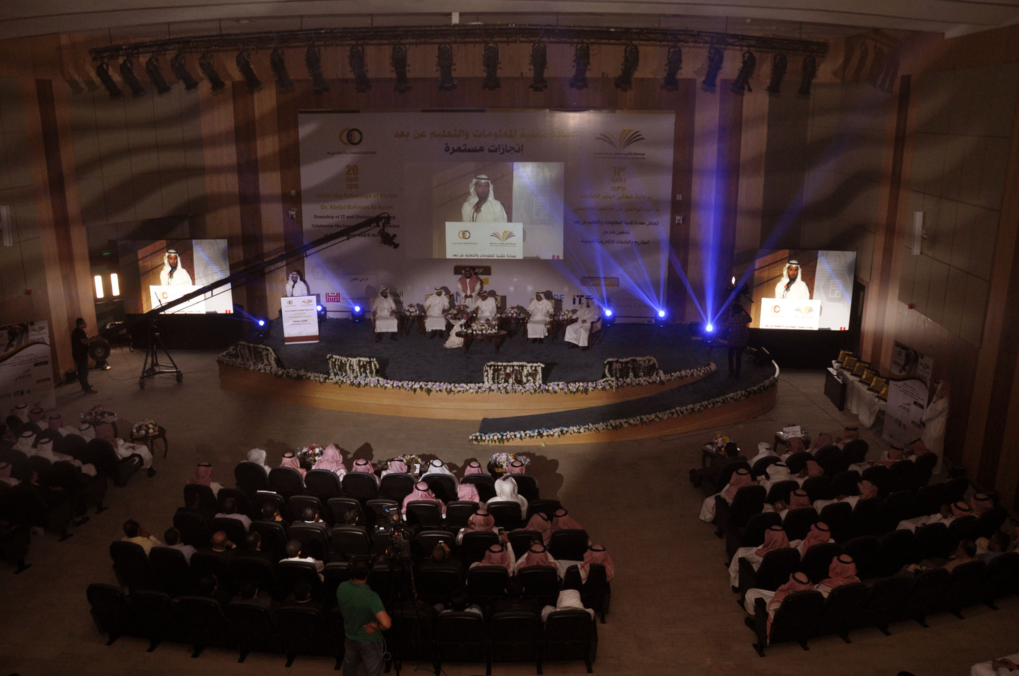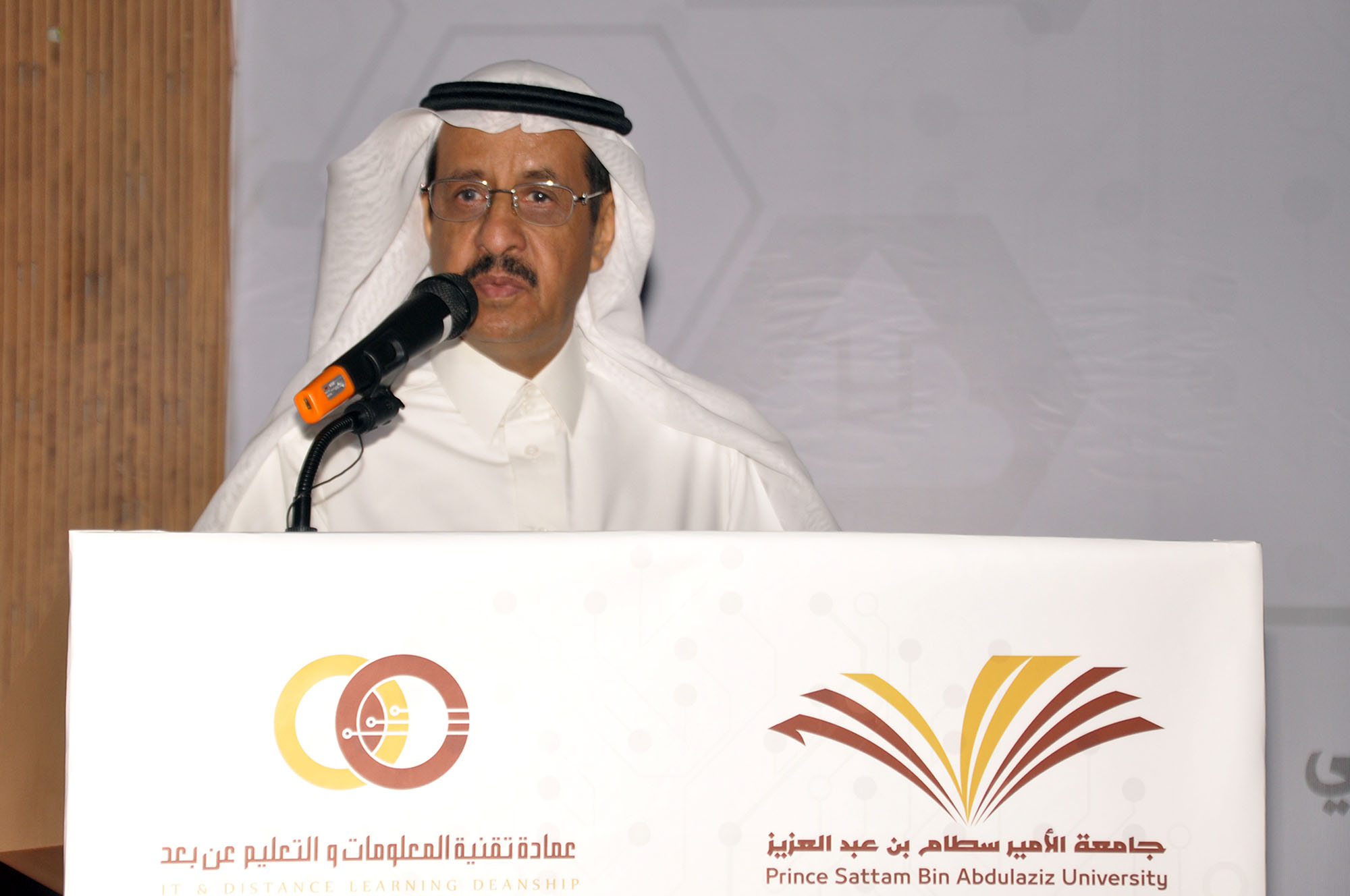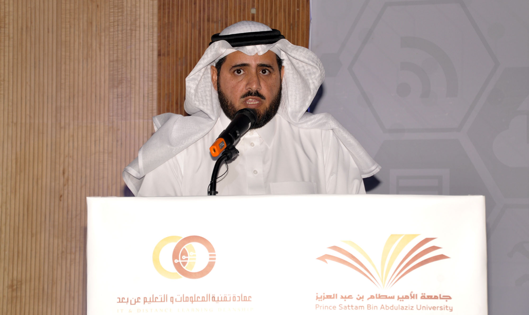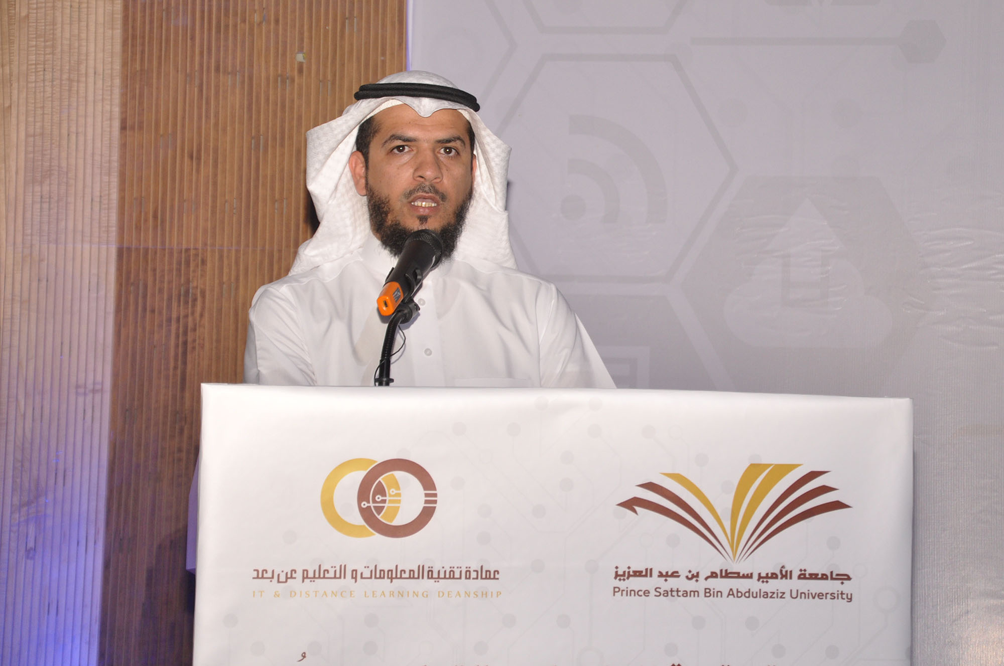 وقد بدأ الحفل الذي قدمه الدكتور تركي الظفيري بتلاوة آيات بينات من الذكر الحكيم للشيخ رائد الحربي، ثم ألقى عميد تقنية المعلومات والتعليم عن بُعد الدكتور محمد بن سعيد القحطاني كلمة رحب في مستهلها بمعالي مدير الجامعة مثمناً دعمه الدائم والمستمر لكل فعاليات العمادة ومشاريعها، كما رحب بوكلاء الجامعة وبحضور سعادة الدكتور عبدالرحمن بن سليمان العريني و الدكتور فهد بن عبدالله الحويماني الذين كان حضورهم مؤشراً كبيرا على العلاقات الاستراتيجية التي تربطهم بالجامعة والتي أيضاً ساهمت بشكل كبير في النجاح الذي وصلت إليه عمادة تقنية المعلومات والتعليم عن بُعد، ثم استعرض جهود العمادة في التحول الإلكتروني بالجامعة والتي توجت بتحقيق المركز الثاني من بين ١٥٠ جهة حكومية أخرى في إتاحة الخدمات الإلكترونية بنسبة مقدارها٩٥،٦٢٪ في القياس السادس الذي أجراه برنامج التعاملات الإلكترونية الحكومية في عام ١٤٣٧ هـ، وتصنيف الجامعة في الفئة الخضراء عند مرصد الخدمات الإلكترونية بنسبة مقدارها ٩١،٥٣٪ بعد أن سجلت لديه أكثر من ٩٤ خدمة إلكترونية، بالإضافة إلى تأسيسها بنية تحتية مناسبة لإطلاق خدماتها التقنية والإلكترونية، ومن ذلك بناء مركز معلومات الجامعة الذي حصل مؤخراً على شهادة الأيزو ٢٧٠٠١ في تطبيق سياسات أمن المعلومات، وقد شكر منسوبي العمادة الذين كان لهم الدور الفاعل في تحقيق هذه الإنجازات بالإضافة إلى شكره لشركاء النجاح من داخل الجامعة وخارجها، وفي ختام كلمته جدد الدكتور القحطاني شكره لمعالي مدير الجامعة ووكلائها لمتابعتهم ودعمهم وجهودهم التي كان لها بالغ الأثر في تحقيق هذه الإنجازات.