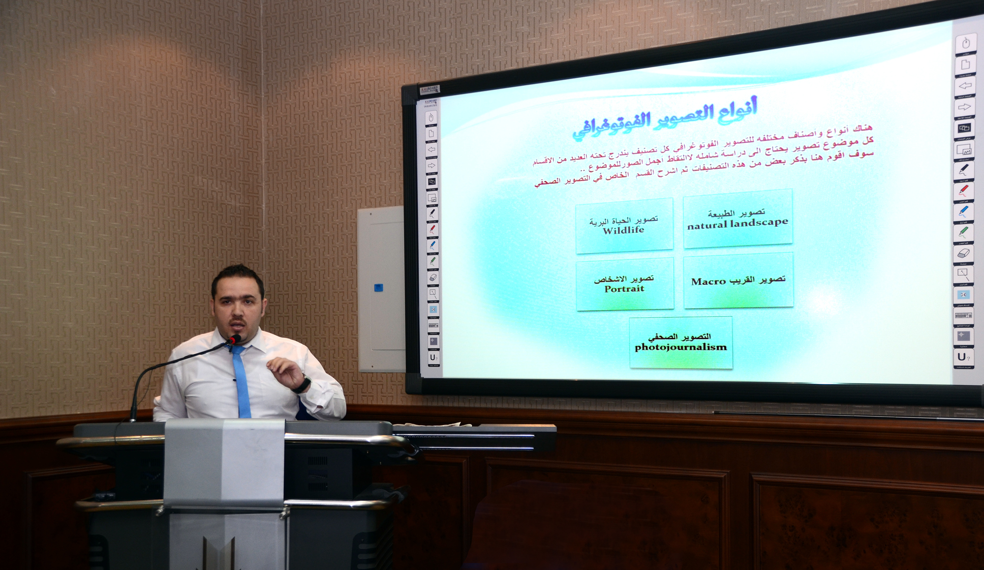 ثم قدم المصور أحمد العليوي ورشة عمل حول فن التصوير الفوتوغرافي، تطرق فيها لأنواع متعددة من الكاميرات ، وقام بشرح لأهم الأساسيات والقواعد التي يبنى عليها التصوير الفوتوغرافي.