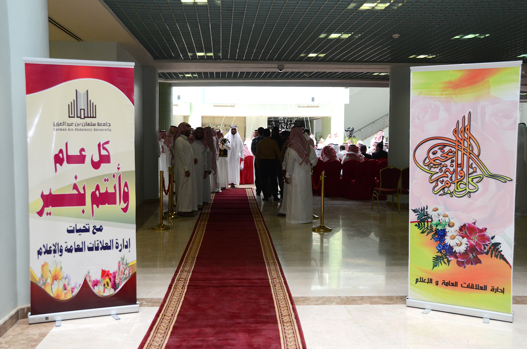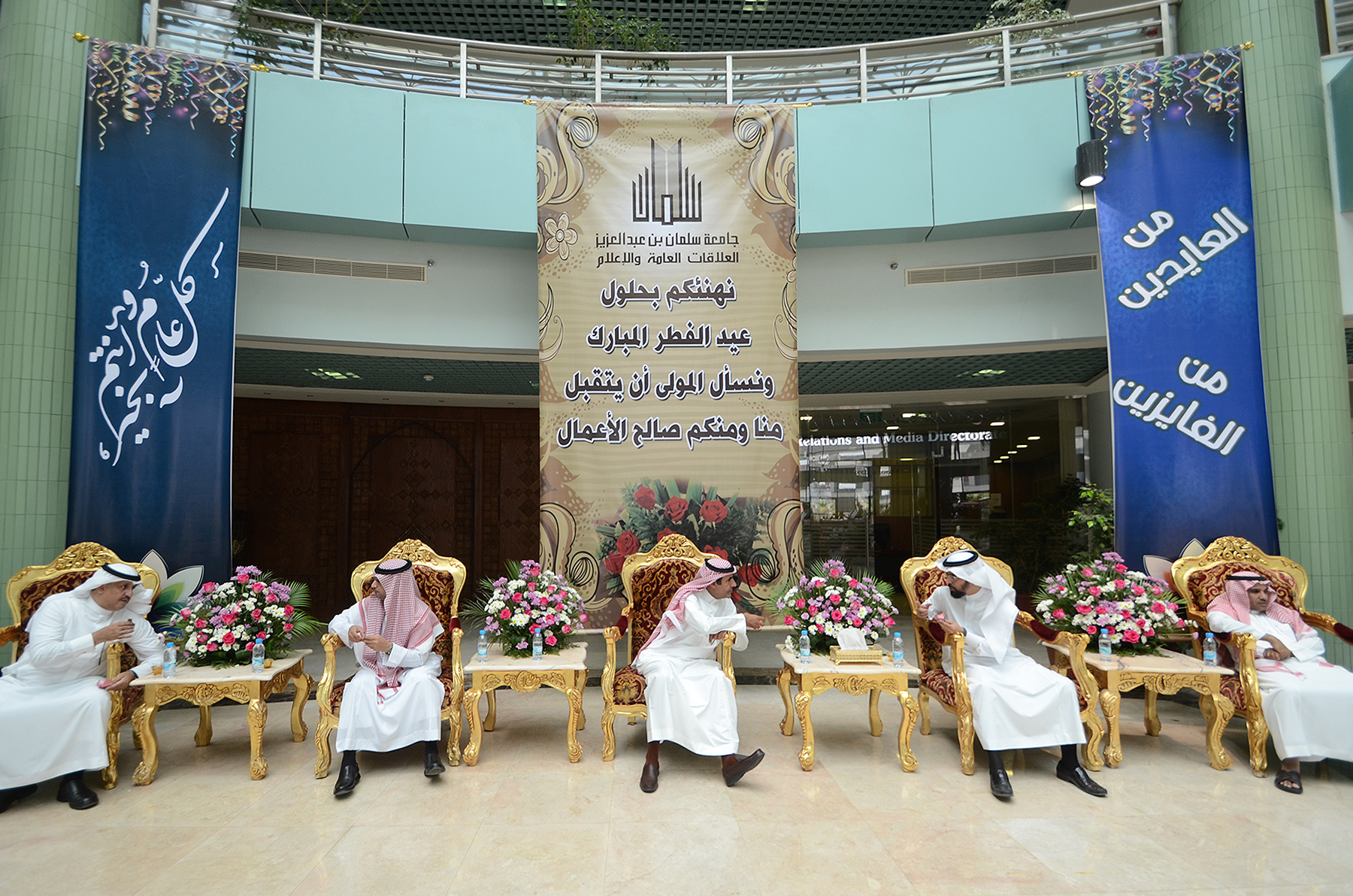 نظمت إدارة العلاقات العامة والإعلام بجامعة سلمان بن عبد العزيز احتفالاً بعيد الفطر المبارك بالمدينة الجامعية بمحافظة الخرج صباح الأحد السابع من شهر شوال, وذلك بحضور معالي مدير الجامعة الدكتور عبد الرحمن العاصمي ووكلاء الجامعة وعمداء الكليات والعمادات المساندة وأعضاء هيئة التدريس وموظفي الجامعة وقدم الدكتور العاصمي التهاني لكافة منسوبي الجامعة بهذه المناسبة السعيدة وذكر المشرف العام على إدارة العلاقات العامة والإعلام أن الجامعة تحرص على إقامة هذا الحفل كل عام لتعزيز العلاقات الاجتماعية بين موظفيها وحتى يتسنى لكافة الموظفين تبادل التهاني بهذه المناسبة المباركة.
