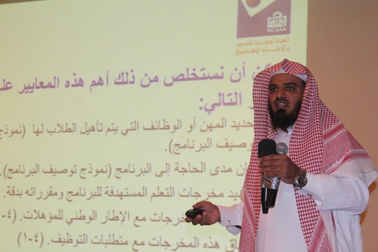 وبيّن مدير اللقاء الدكتور عائض الشهراني معايير الهيئة الوطنية للتقويم والاعتماد الأكاديمي المتعلقة ببناء البرامج والخطط الدراسية وتطويرها، وذكر من هذه المعايير تحديد المهن والوظائف التي يتم تأهيل الطلاب لها، وبيان مدى الحاجة إلى البرنامج وتحديد مخرجات التعلم المستهدفة للبرنامج ومقرراته بدقة، كما أشار إلى إجراءات إقرار البرامج والخطط الدراسية وعلاقتها بالمعايير، وناقش الدكتور الشهراني النماذج والوثائق المطلوبة لبناء البرامج والخطط الدراسية أو تطويرها وفق معايير الهيئة.
