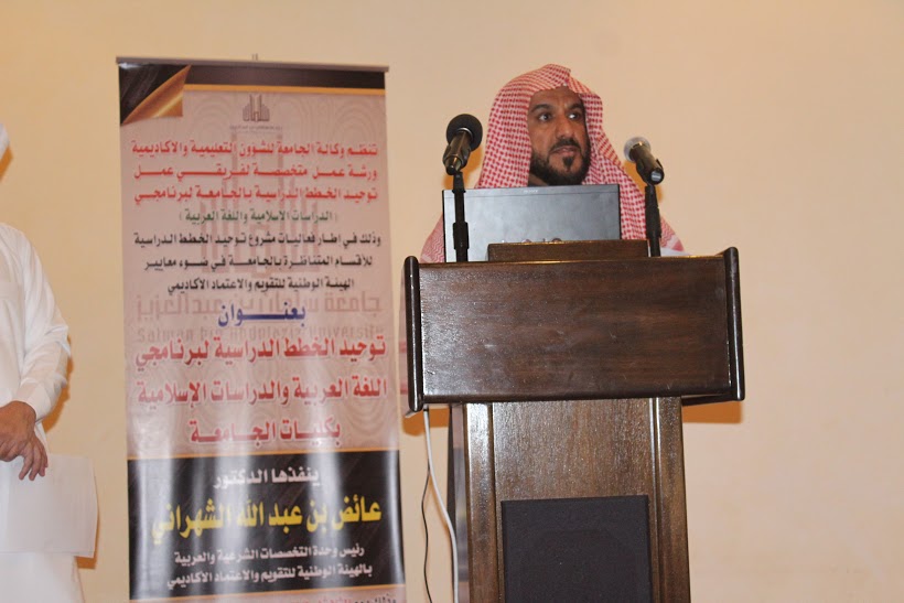 وقد أوضح الدكتور عبدالرحمن الخضيري أن الجامعة ممثلة في وكالة الشؤون التعليمية والأكاديمية تبنت مشروع توحيد الخطط الدراسية للتخصصات المتماثلة في كليات الجامعة، وذلك إيماناً منها بأن سر نجاح التدريس الجامعي وتميزه يكمن في التخطيط الدقيق في كافة العملية التعليمية وخاصة في تخطيط البرامج الدراسية، مشيراً إلى أن هذه الورشة تقام بالتنسيق مع الهيئة الوطنية للتقويم والاعتماد الأكاديمي حتى تكون مخرجات البرنامجين متوائمة مع ما تم اعتماده من قبل الهيئة.