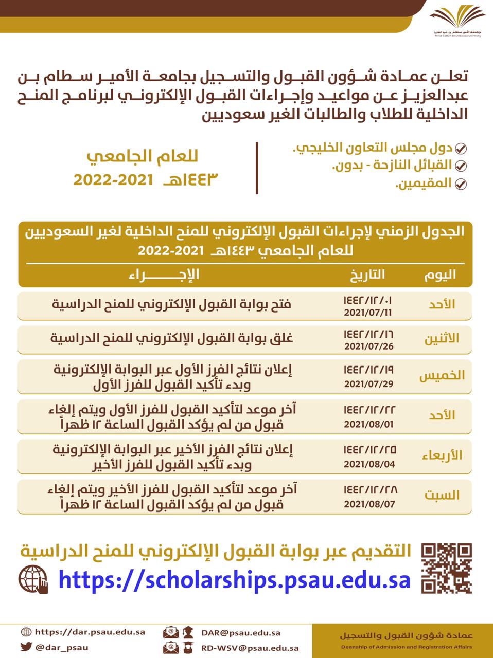 تعلن عمادة شؤون القبول والتسجيل عن مواعيد وإجراءات القبول الإلكتروني لبرنامج المنح الداخلية للطلاب والطالبات الغير سعوديين للعام الجامعي 1443هـ، 2021م-2022م