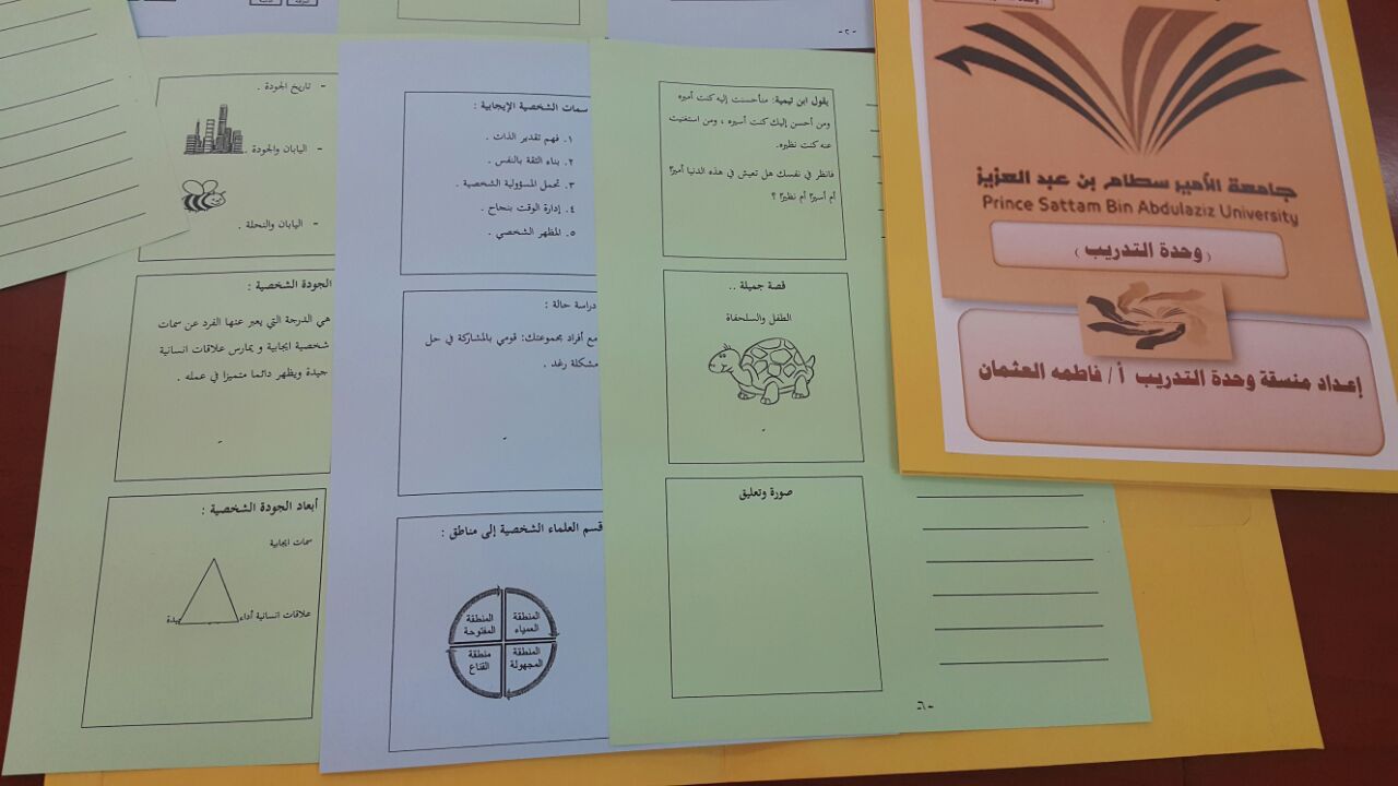 نظمت وحدة التدريب بكلية العلوم والدراسات الإنسانية بالأفلاج بقاعة الإجتماعات ورشة عمل تدريبية بعنوان ( الجودة الشخصية ) , قدمتها د:فاطمة كمال , تحدثت عن أبعاد الجودة الشخصية و العوامل التي تساعد على نجاحها , وتهدف إلى تنمية قدرات الإداريات و تدريبهن على بعض خصائص الجودة الشخصية , وقد حضر الورشة عدد كبير منأعضاء الهيئة الإدارية .