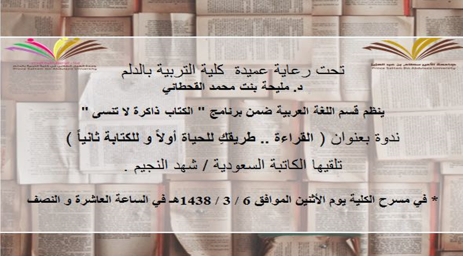 استضافت كلية التربية بالدلم الكاتبة شهد النجيم ضمن فعالية " الكتاب ذاكرة لا تنسى" حيث عقدت ندوة ( القراءة طريقكِ للحياة أولاً وللكتابة ثانيًا) تحت إشراف قسم اللغة العربية ووحدة العمل الطلابي، صباح يوم الاثنين الموافق 6/3/1438هـ على مسرح الكلية .